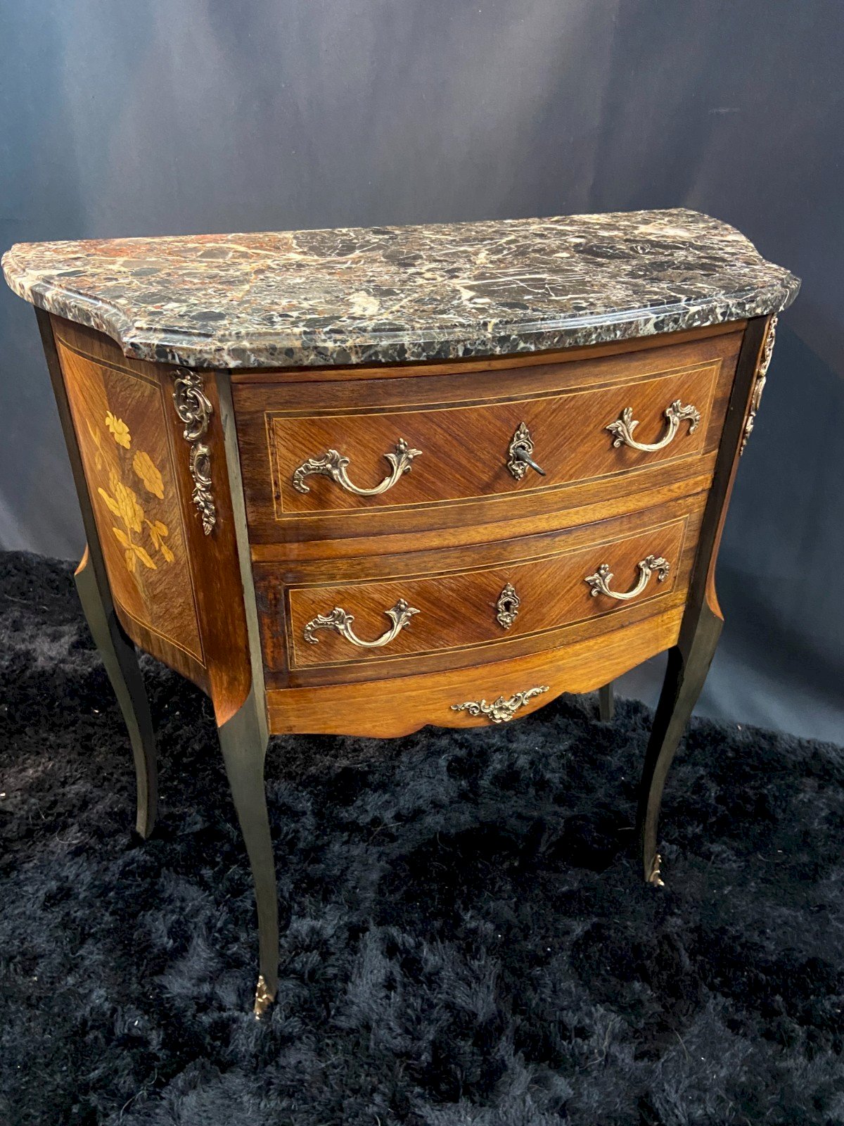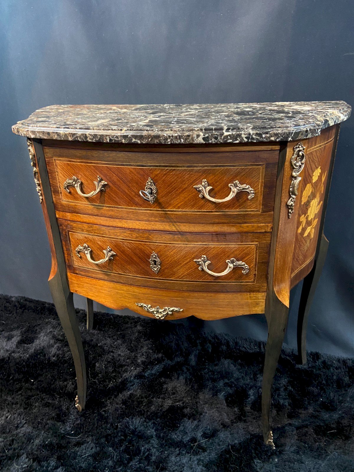 Petite commode demi-lune à décor marqueté rehaussé de bronze de style Louis XV ouvrant à deux tiroirs. Epoque XXe Proportions très facilement logeables Dimensions max : Hauteur 71 x 67,2 x 33,5 cm Présence d'une clé opérationnelle Je signale de l'usure en surface avec rayures, ainsi qu'une usure plus prononcée en bordure gauche du tiroir inférieur Retrait gratuit possible dans le centre historique de Bourges (Église Notre-Dame) . - Les commandes sont déposées au pied de votre domicile - Les dimensions sont  toujours précisées : aucune contestation ne sera admise si le meuble ne passe pas dans votre escalier ou si votre plafond est trop bas...par exemple. - Des tarifs de livraison spécifiques s'appliquent pour les îles : Corse, Sardaigne, Sicile, Baléares......... - Les délais sont généralement très courts pour toutes les grandes agglomérations  - Ces derniers peuvent être rallongés pour des destinations extrêmement isolées et particulièrement mal desservies : n'hésitez pas à me contacter préalablement. Couleur:Marron Type:Commode, Chiffonnier Période:XIXème et avant Origine:France Pays d'origine:France Sous-type:2 tiroirs Style:Louis XV, Néoclassique Matière:Noyer
