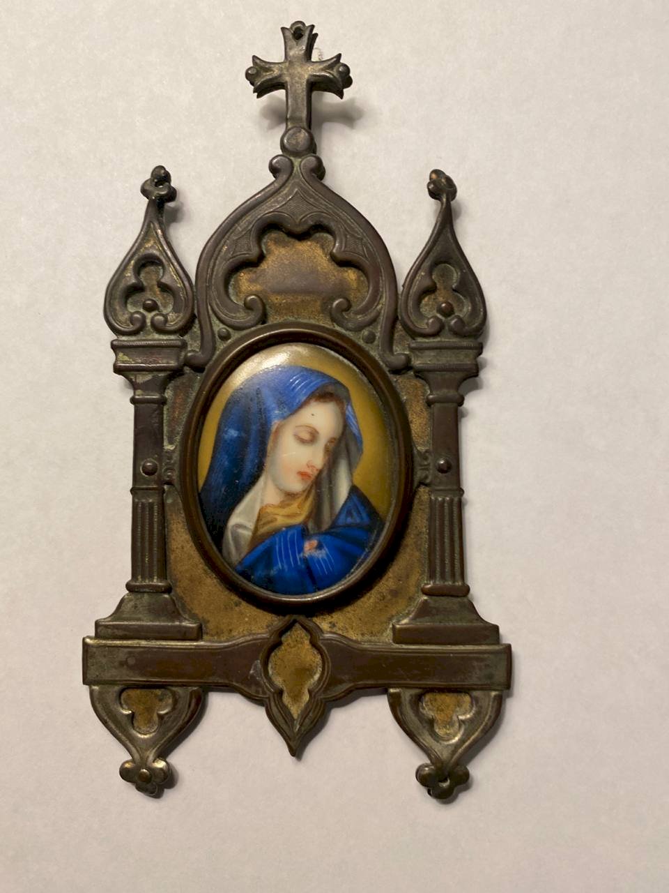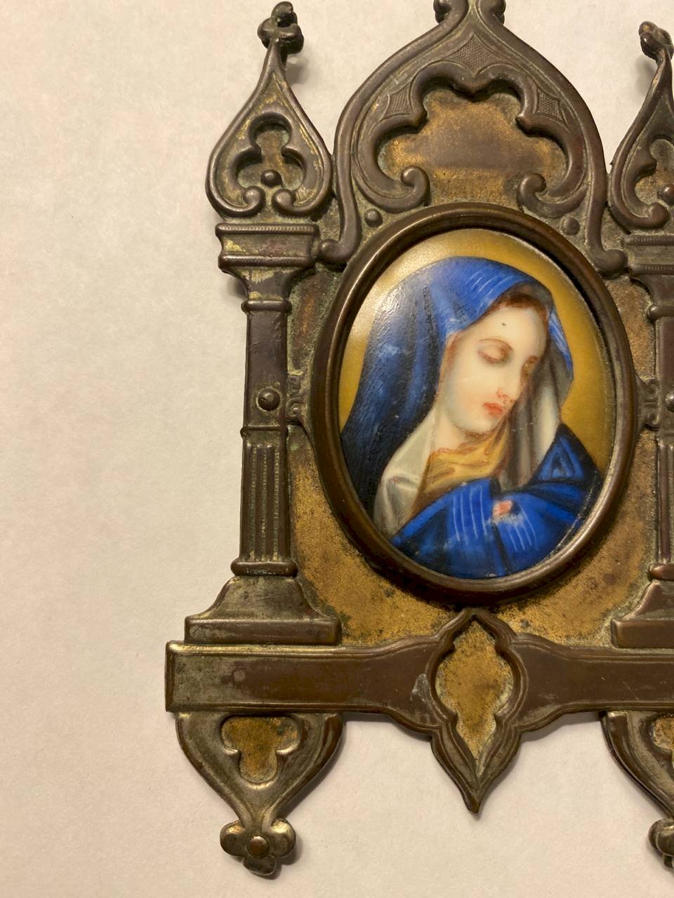 Petite icône domestique ancienne représentant la Vierge Marie, peinte avec finesse sur support émaillé ou porcelaine, montée dans un encadrement architectural en métal doré à décor néogothique.