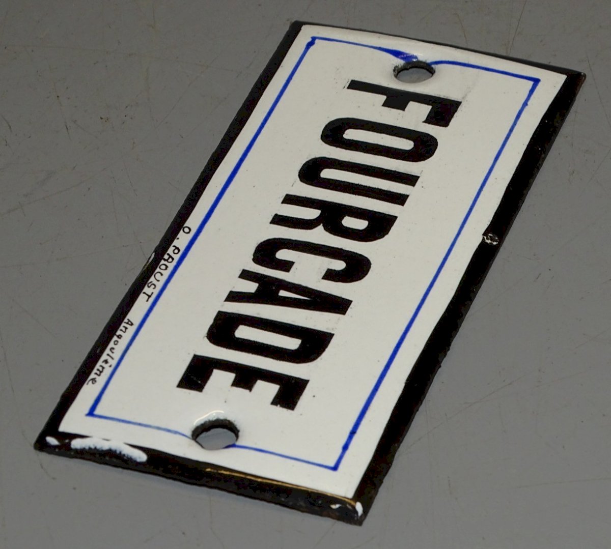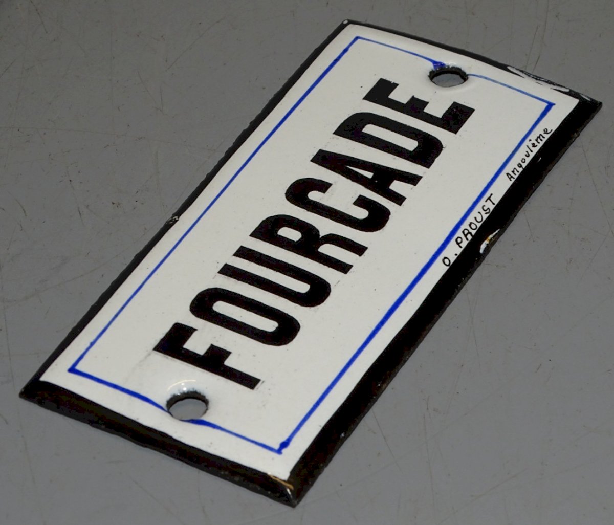 Jolie petite plaque émaillée émailleur O PROUST Angoulême - marquée FOURCADE - avec usures sur les bords et traces de rouille au dos - ( photos )  -  dans son jus de trouvailles, sortie de grenier  (voir photos )   - Réf. 1V230712/618 - 8,1 x 4 cm - Poids 34 grammes    EXPEDITION POSSIBLE EN MONDIAL RELAY ou COLISSIMO sur demande TRES BON EMBALLAGE GARANTI                             MERCI de BIEN REGARDER TOUTES les PHOTOS car ELLES FONT PARTIE INTEGRANTE de la DESCRIPTION et PERMETTENT de VOIR l'OBJET AU MIEUX  avec SES PETITS DEFAUTS EVENTUELS - État:Occasion: Objet ayant été utilisé. Consulter la description du vendeur pour avoir plus de détails ...Occasion: Objet ayant été utilisé. les éventuelles imperfections.