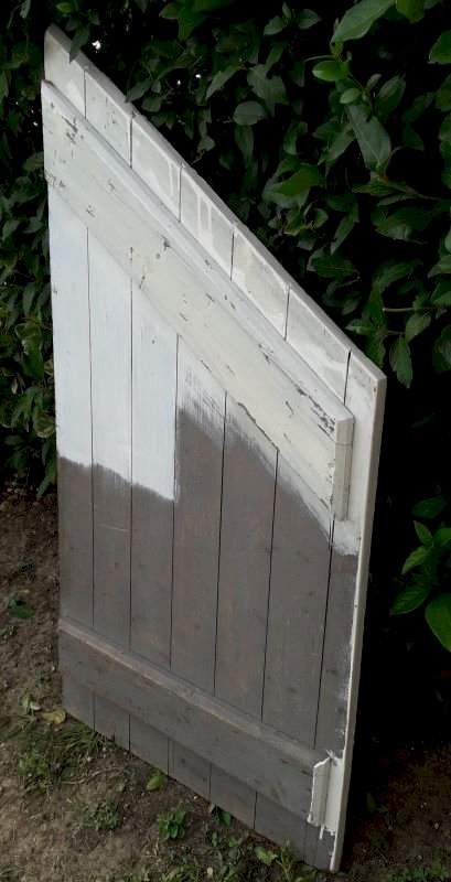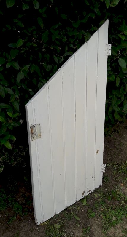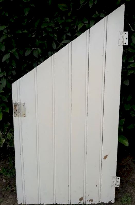 Petite porte (trappe d’escalier) peinte en blanc satiné à l’extérieur et gris et blanc à l’intérieur, à la découpe en pente : 120,5cm au plus haut et 76cm au plus bas, de 60 à 60,5cm de large, munie de deux charnières.