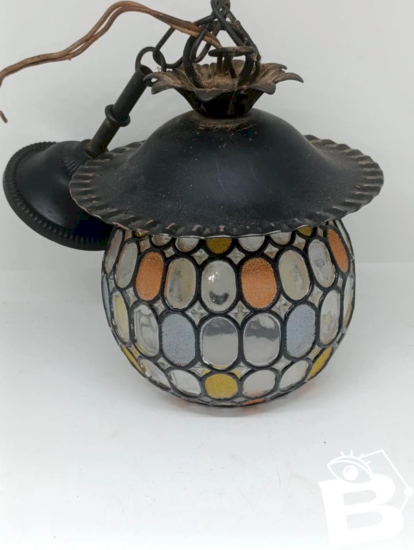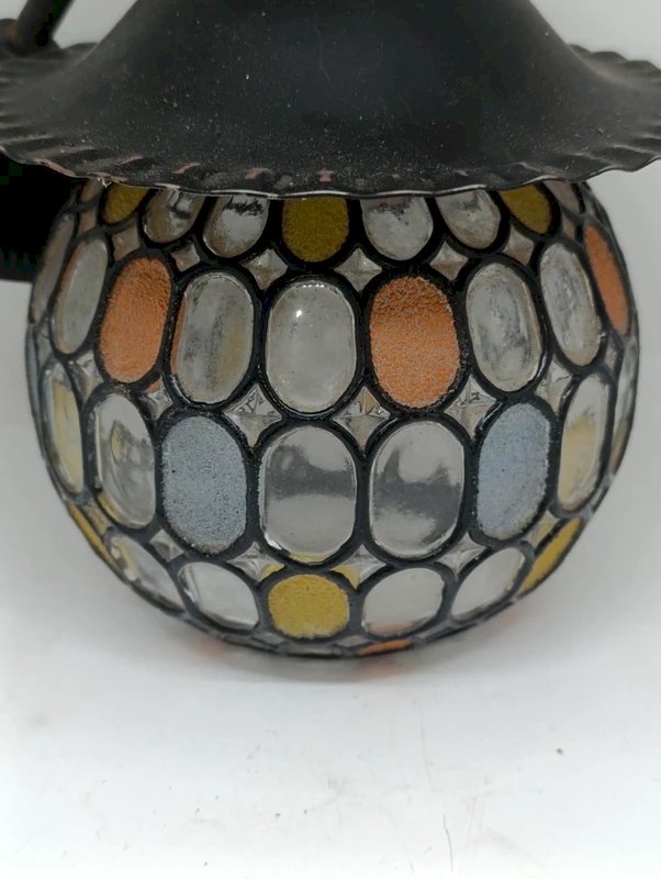petite suspension globe style vitraux en bon etat patine du temps et partie metallique à nettoyer hauteur 18cm hors chaine et globe diametre 14cm