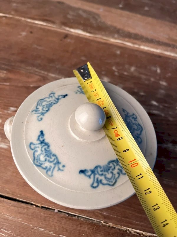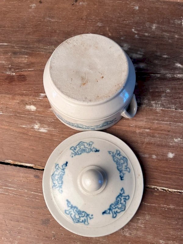 De couleur blanc crème avec petits motifs bleus, caractéristiques de cette provenance.