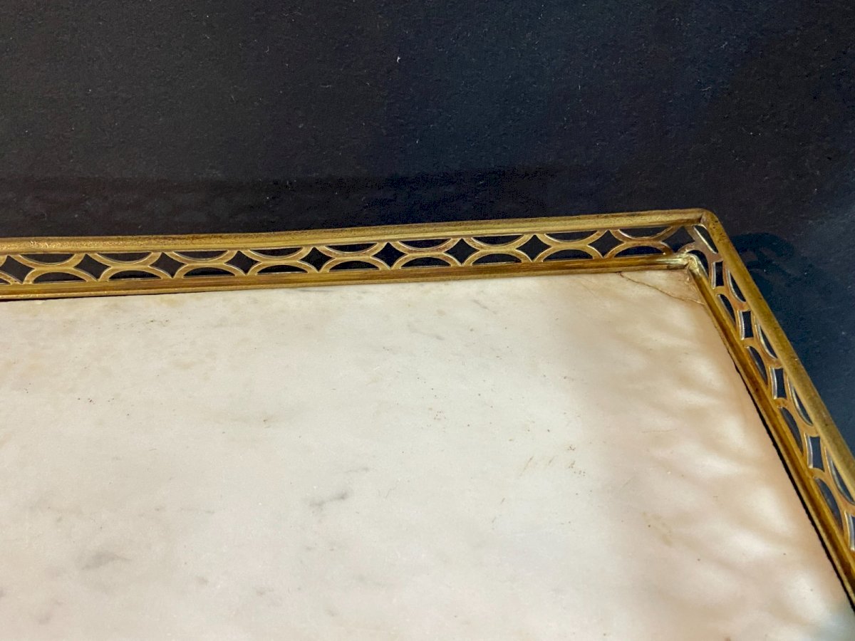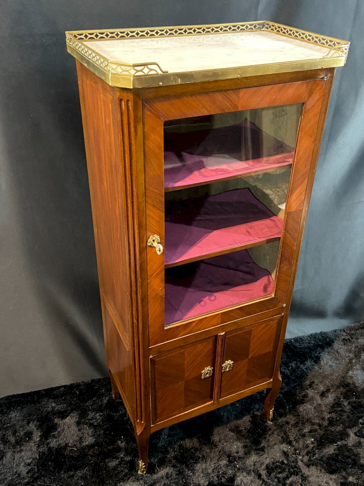 Petite vitrine XIXe de style Transition Louis XV - Louis XVI Partie supérieure ouvrant à une porte vitrée. Partie inférieure ouvrant à deux vantaux Etagères simplement recouvertes d'un tissu pourpre de qualité Marbre blanc encastré entouré d'une galerie de laiton à décor ajouré  Proportions facilement logeables  Dimensions max : Hauteur 124,8 x 53,2 x 34,9 cm Je signale une discrète restauration au niveau de l'angle arrière droit du marbre et autres diverses petites marques usuelles La clé est non fonctionnelle : cette dernière permet le tirage de la porte vitrée. Retrait gratuit possible dans le centre historique de Bourges (Église Notre-Dame) . - Les commandes sont déposées au pied de votre domicile - Les dimensions sont  toujours précisées : aucune contestation ne sera admise si le meuble ne passe pas dans votre escalier ou si votre plafond est trop bas...par exemple. - Des tarifs de livraison spécifiques s'appliquent pour les îles : Corse, Sardaigne, Sicile, Baléares......... - Les délais sont généralement très courts pour toutes les grandes agglomérations  - Ces derniers peuvent être rallongés pour des destinations extrêmement isolées et particulièrement mal desservies : n'hésitez pas à me contacter préalablement. Type:Vitrine Origine:France Période:XIXème et avant Pays d'origine:France Style:Louis XV, Néoclassique Matière:Noyer