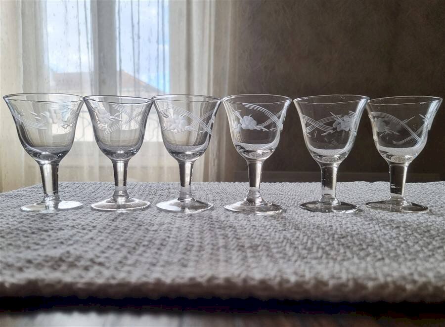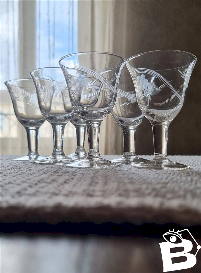 Ensemble de 6 petits verres à pied, verres à digestif.Dimensions: 9.5 X 6 cm environ.Profondeur: 5 cm.Poids: 400 g environ.