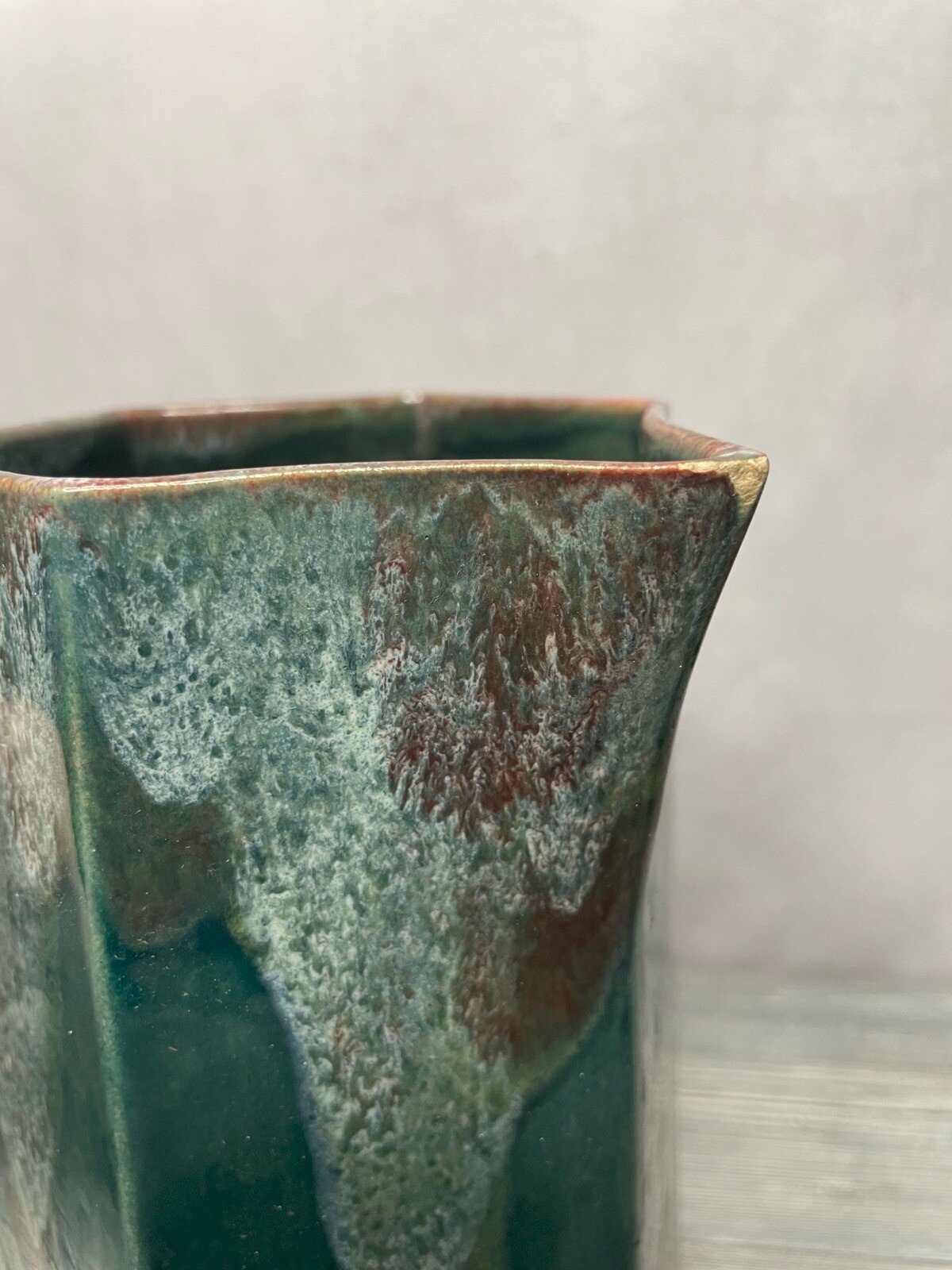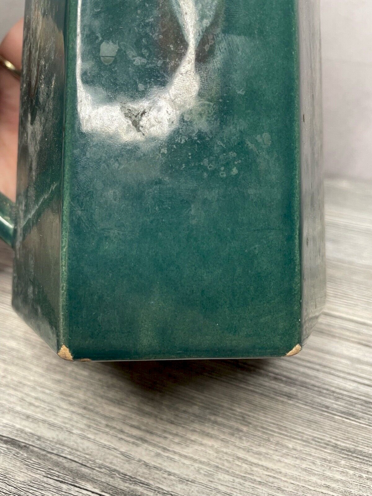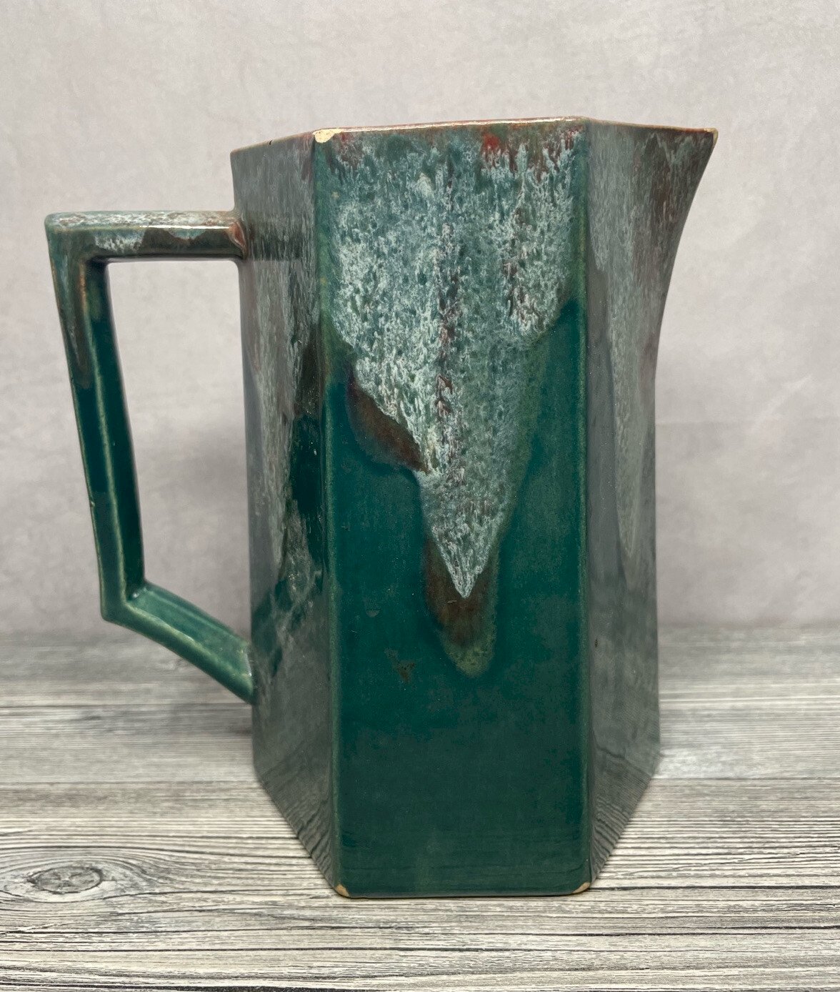 Pichet / cruche / carafe céramique vert à coulures DLG Lacheny non signé non signé, DLG de Lacheny, à  identifier Hauteur +/- 1 7,5 cm À restaurer, présence de nombreux éclats, voir photos Pensez à grouper vos achats pour réduire les frais de port !