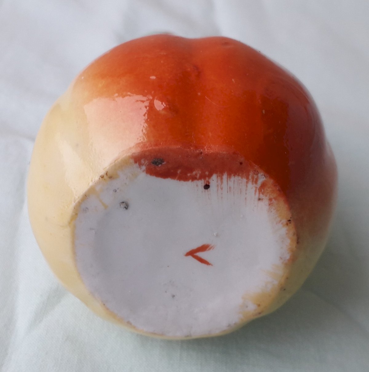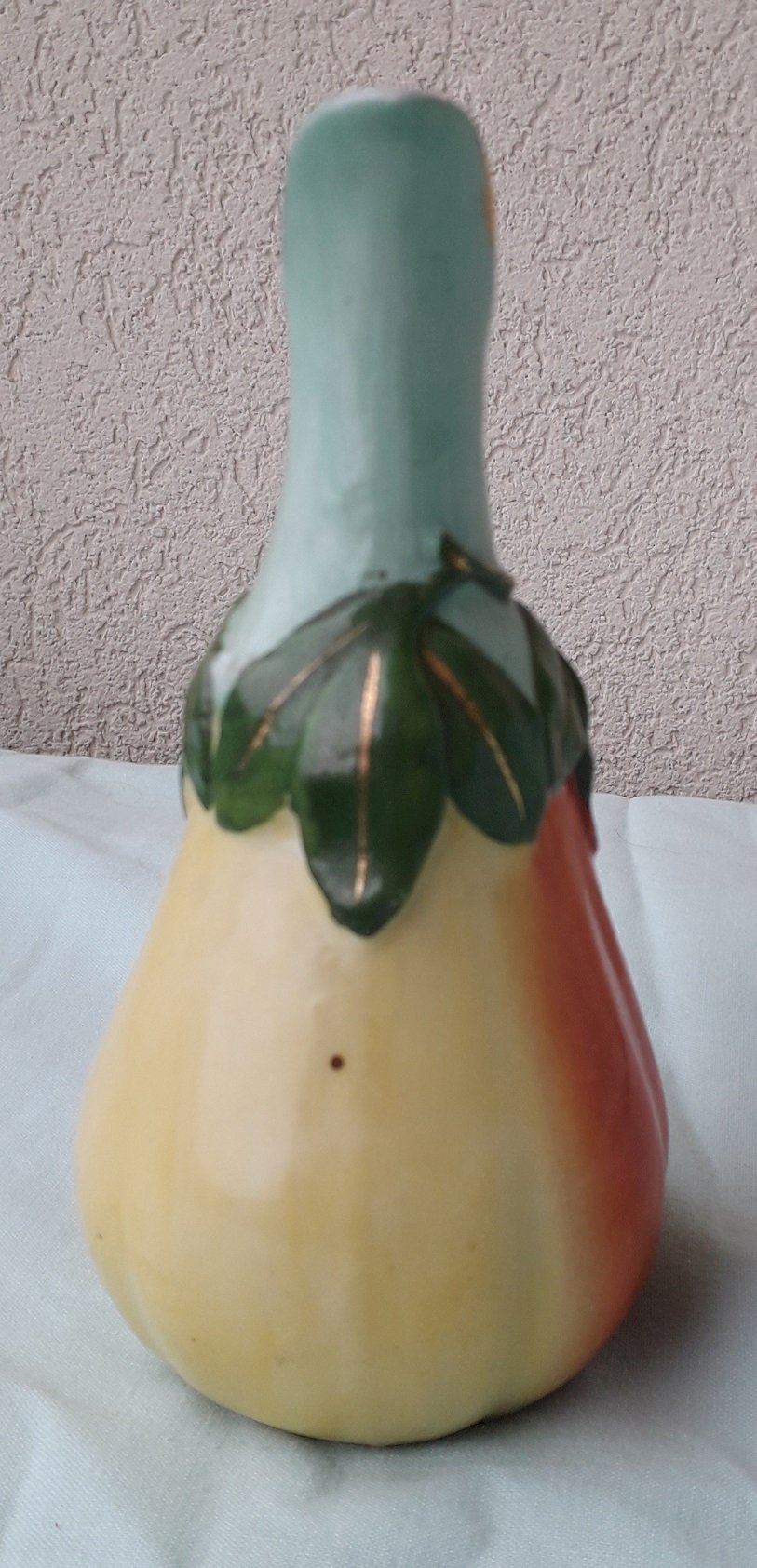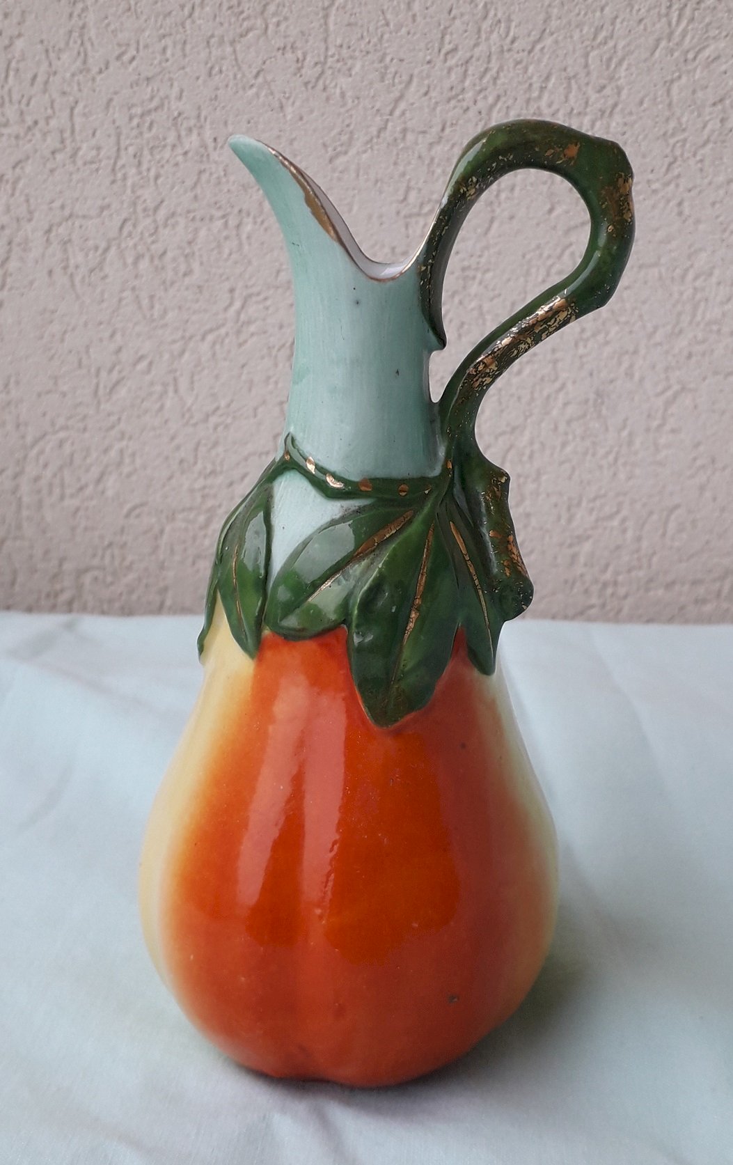 Petit pichet carafe, en porcelaine polychrome, en forme de poire, marque "V" en dessous.
