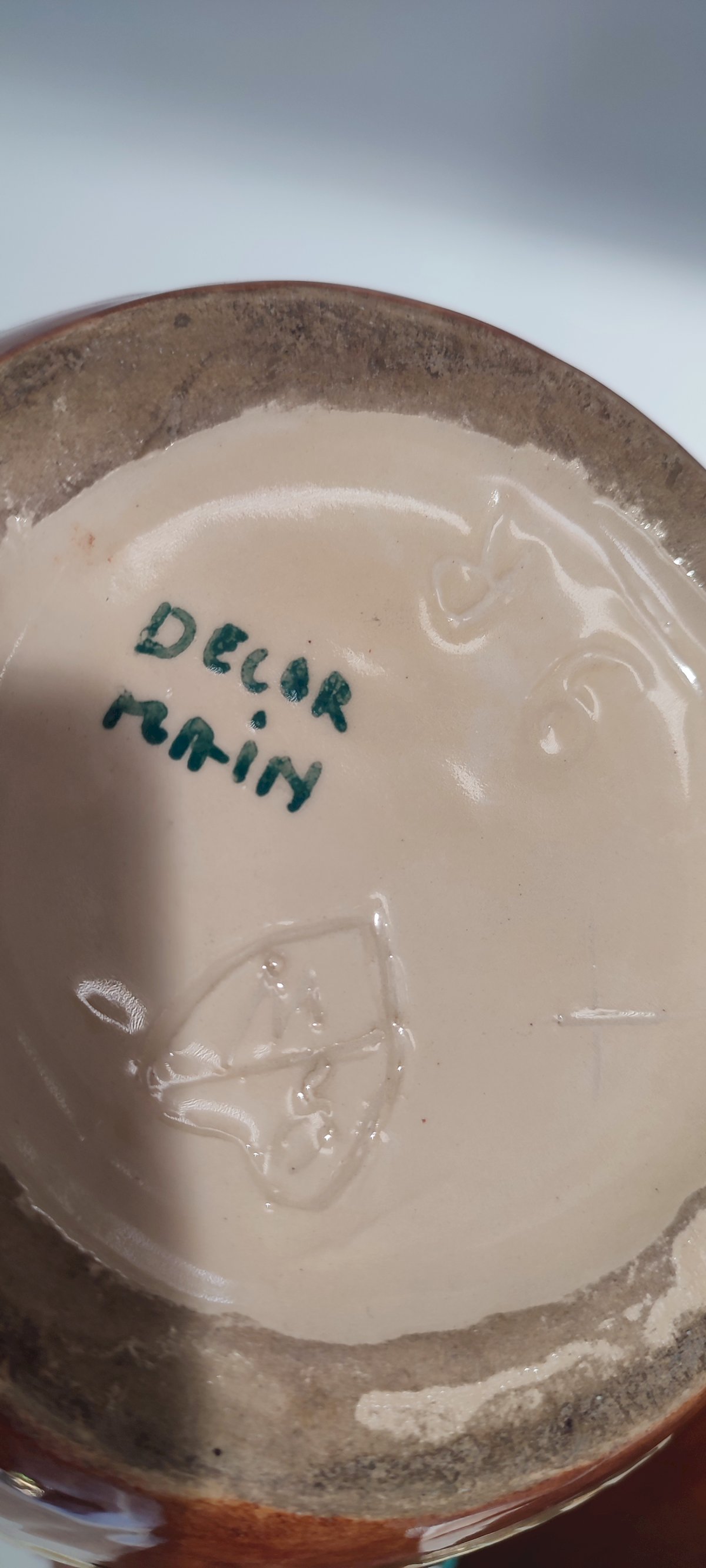 Le fond porte un tampon en forme de cœur, signature d’atelier et un repère et numéro de décorateur , travail artisanal des années 1950–1970.
