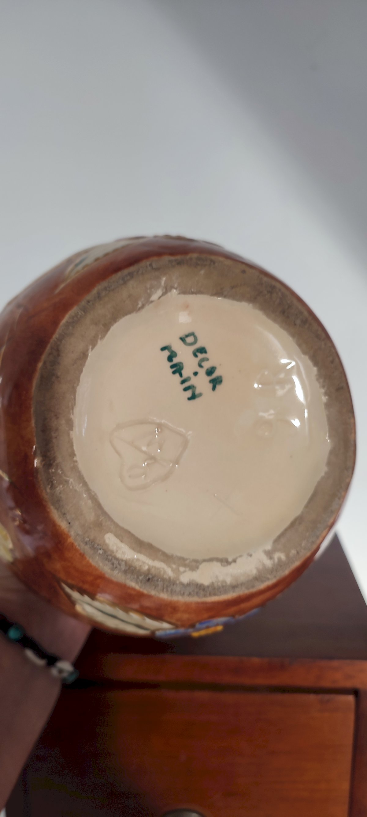 Pichet vase en céramique à grand bec , décoré entièrement à la main (« Décor Main » inscrit sous la base).