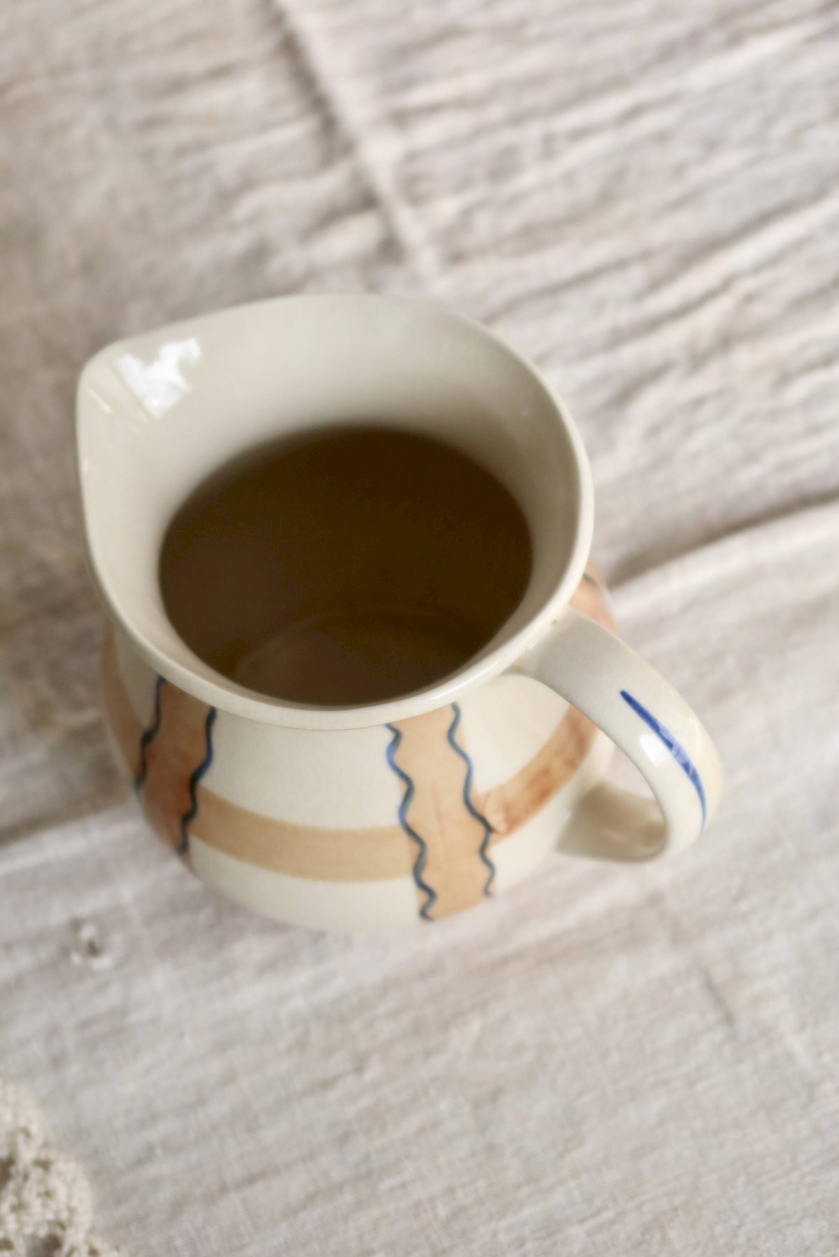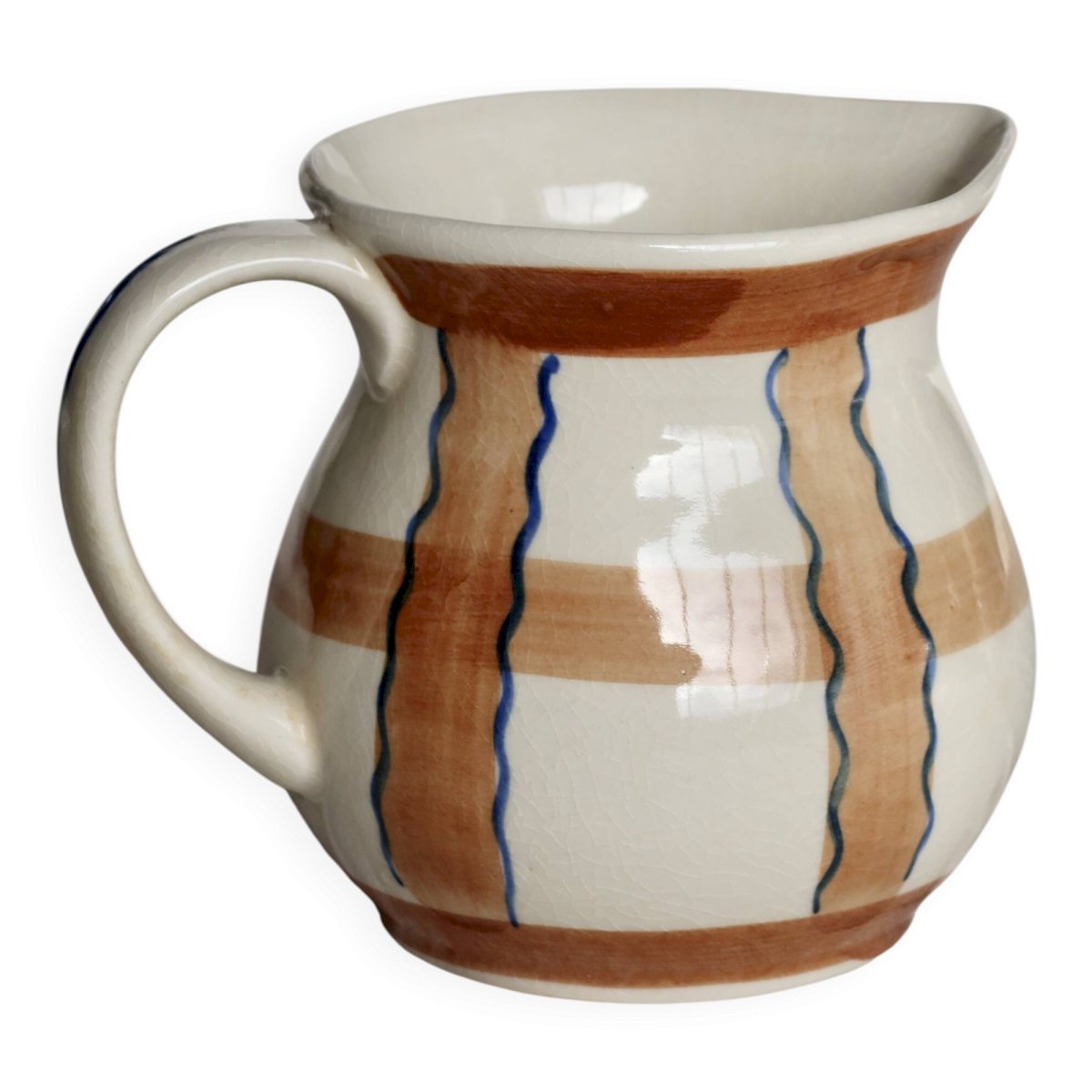 Pichet ancien en céramique émaillée, aux tons beige et marron, décoré de motifs peints à la main soulignés de lignes bleues.