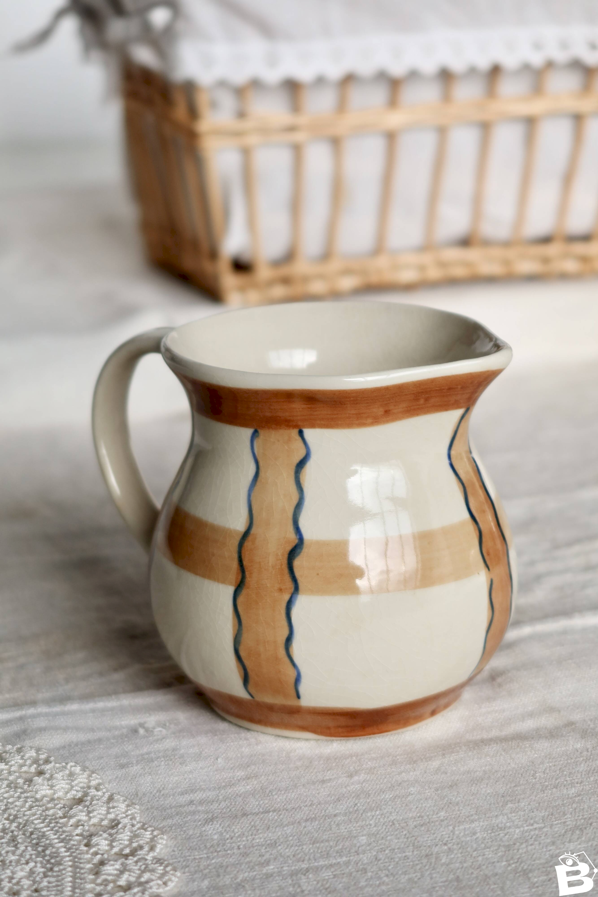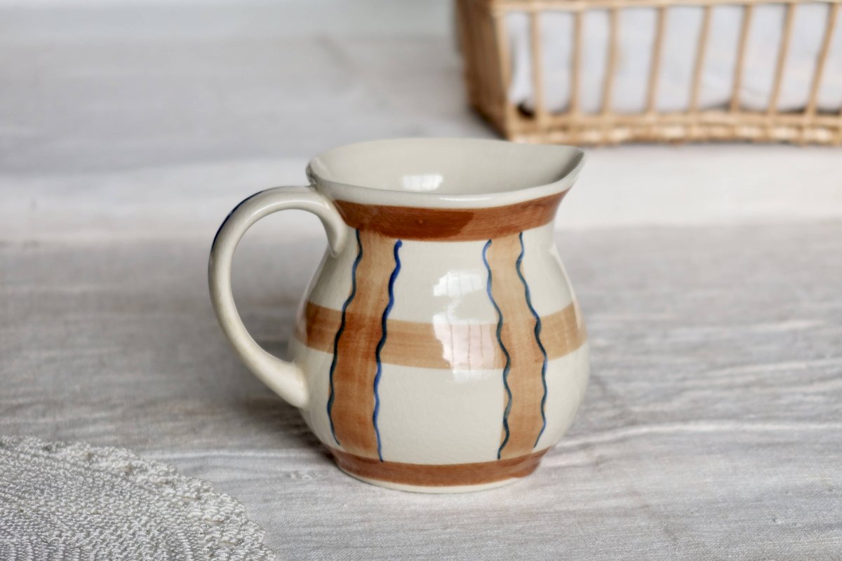 Pichet vintage en céramique émaillée beige et marron peint à la main – Déco
