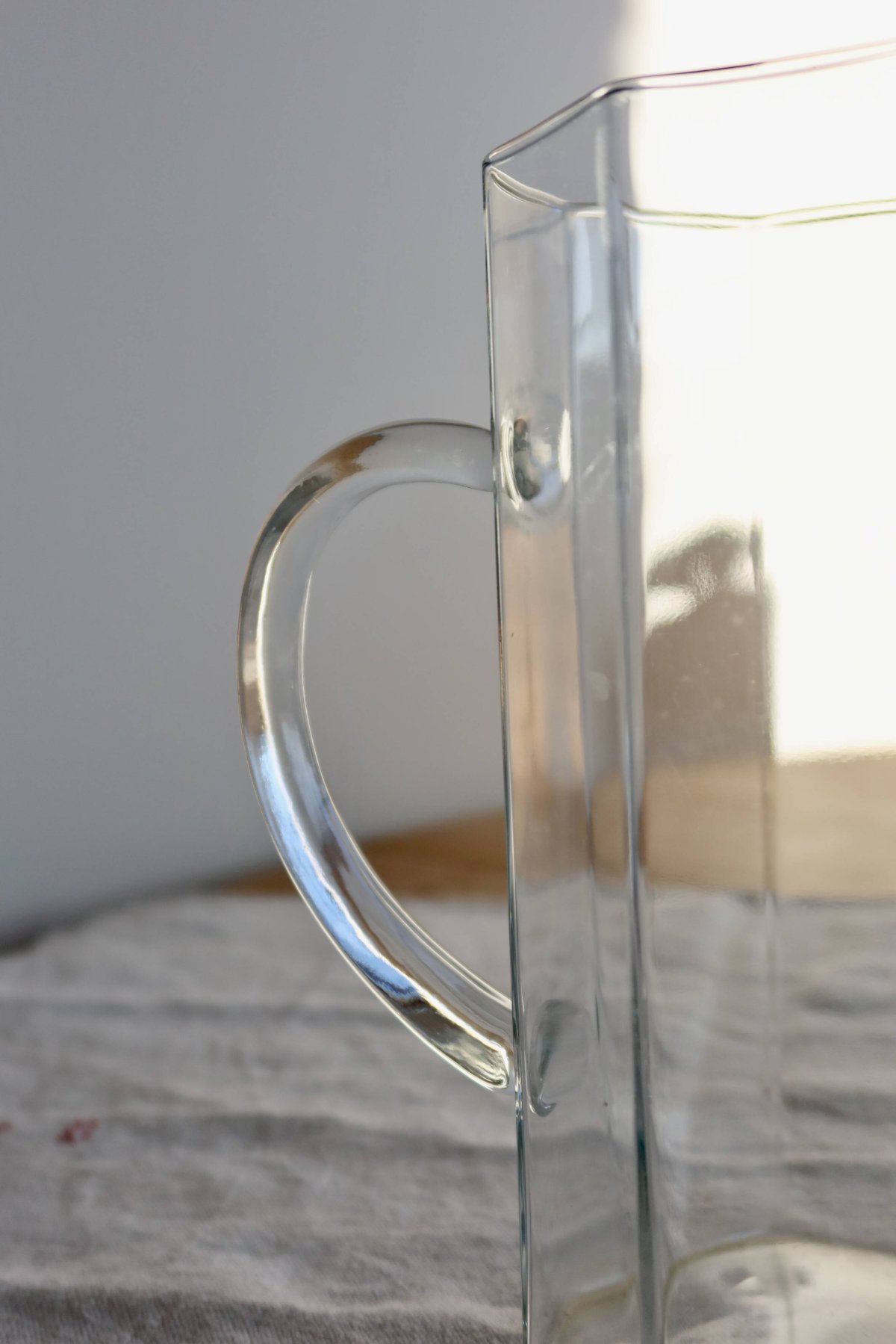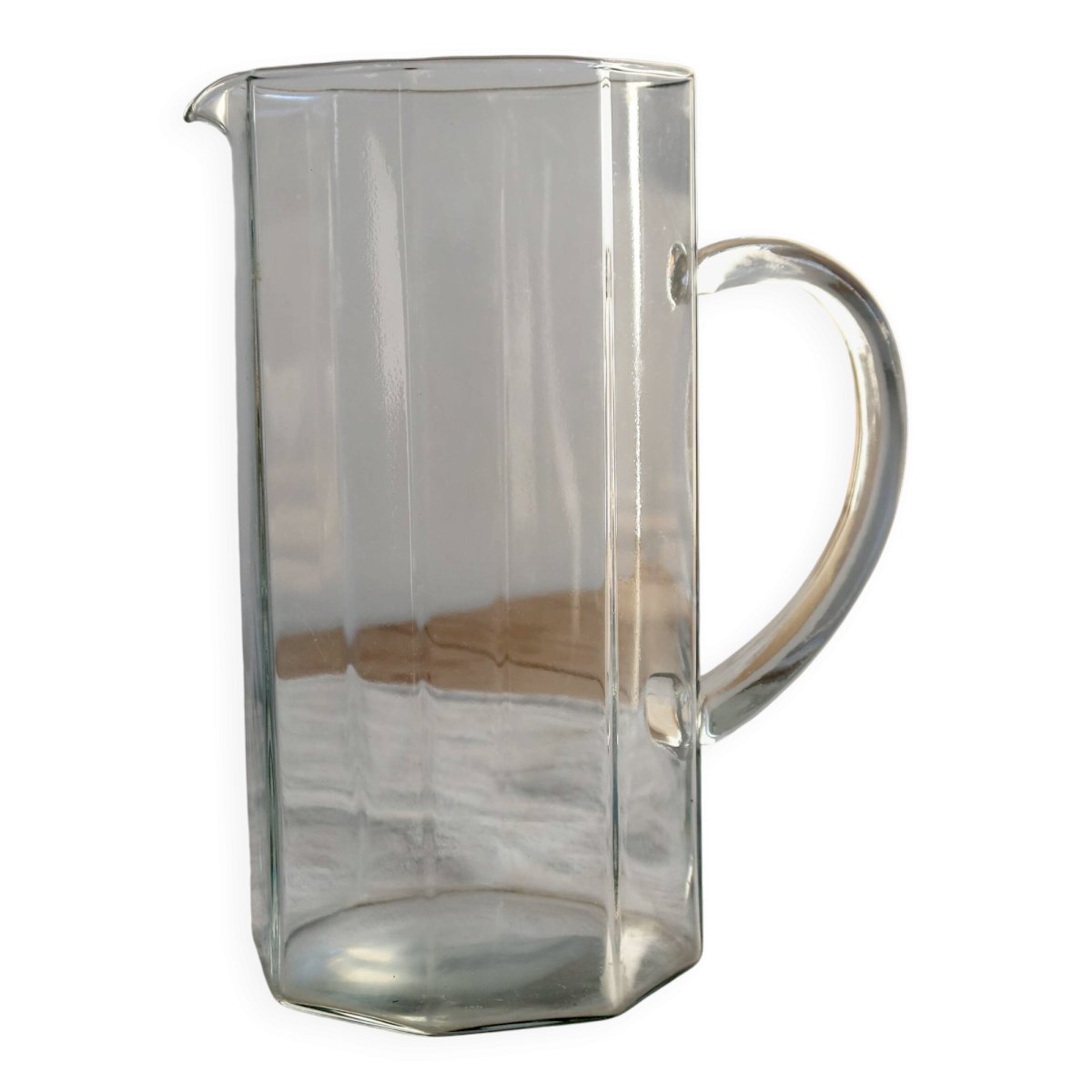 Pichet en verre transparent à silhouette octogonale, au design simple et élégant typique de la verrerie des années 1970.
