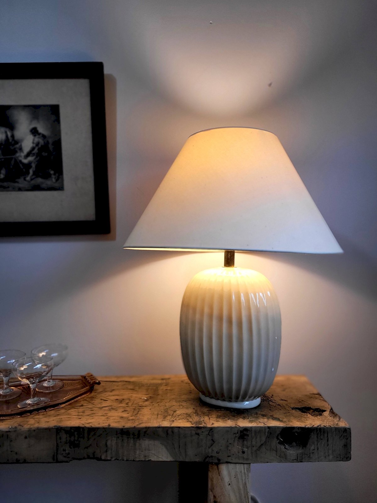 On aime son côté chaleureux.En bon état général, très légèrement ébréchée sur un côté (voir photos).Douille E27 standard.