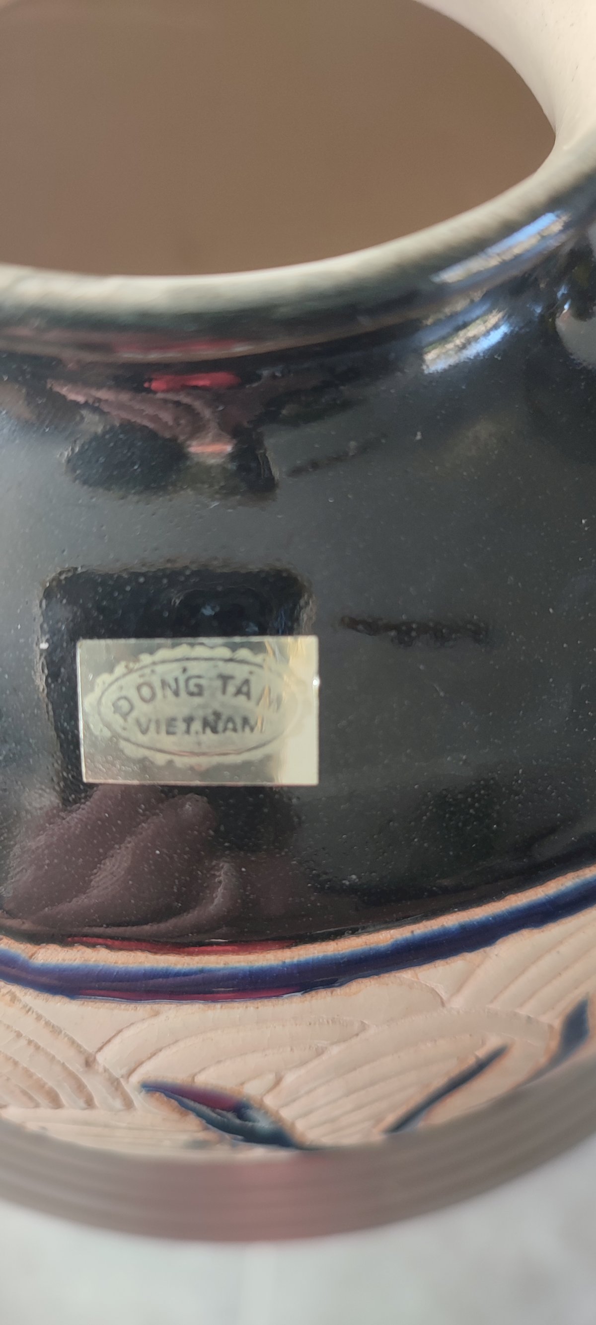 Origine : présence de l'étiquette Dong Tam qui est un centre de production de céramique bien connu au Vietnam (souvent associé à la région de Bien Hoa ou de Bat Trang).
