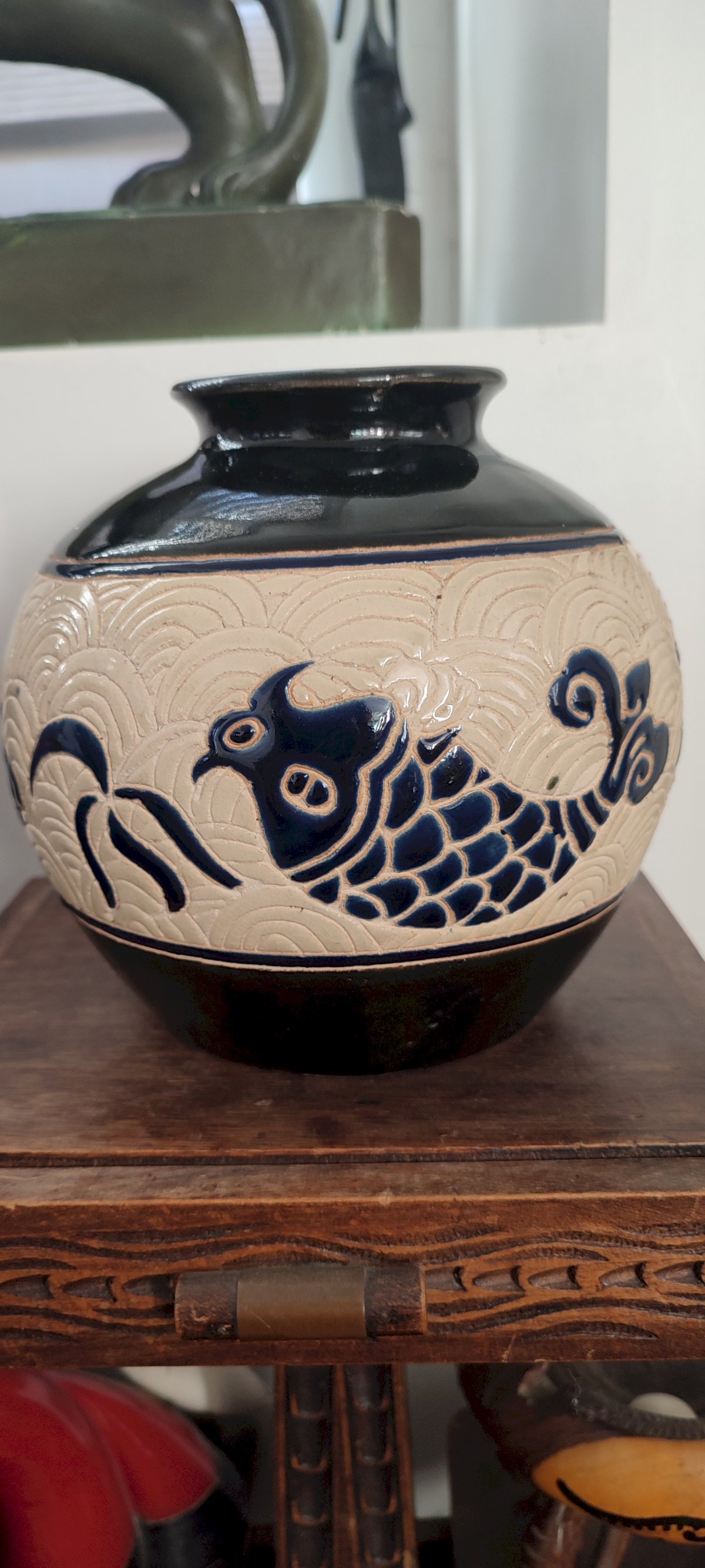 Technique : Décor incisé à la main et émaillé (bleu cobalt, ivoire et noir).