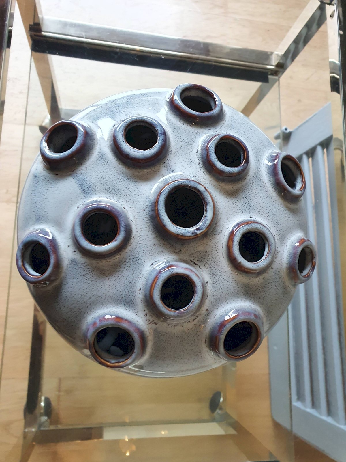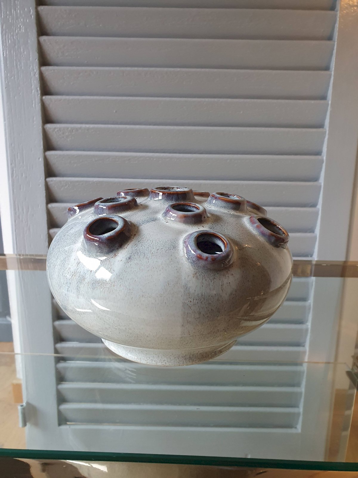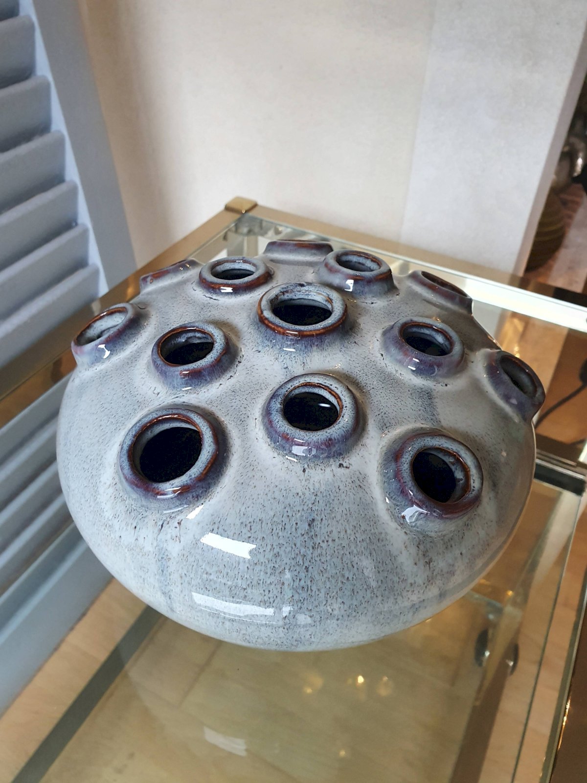 Gros pique-fleurs en céramique, l'émaillage est dans les tons gris bleus avec coulures.
