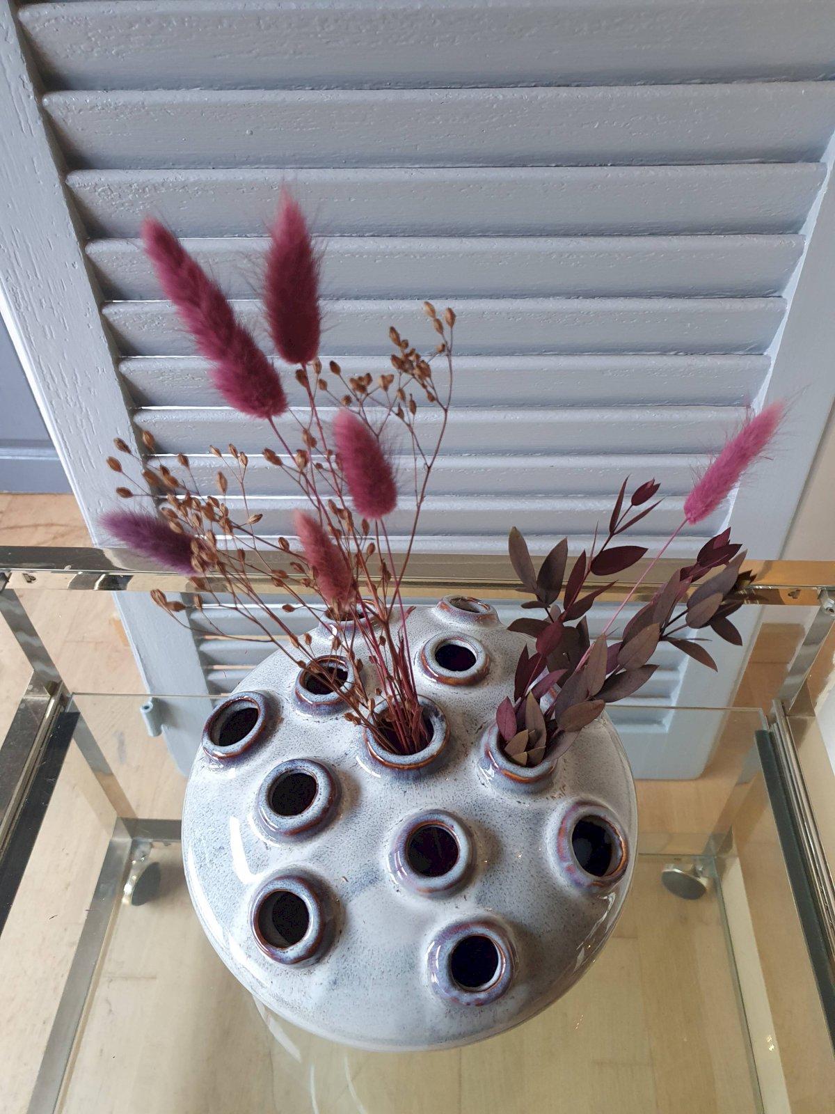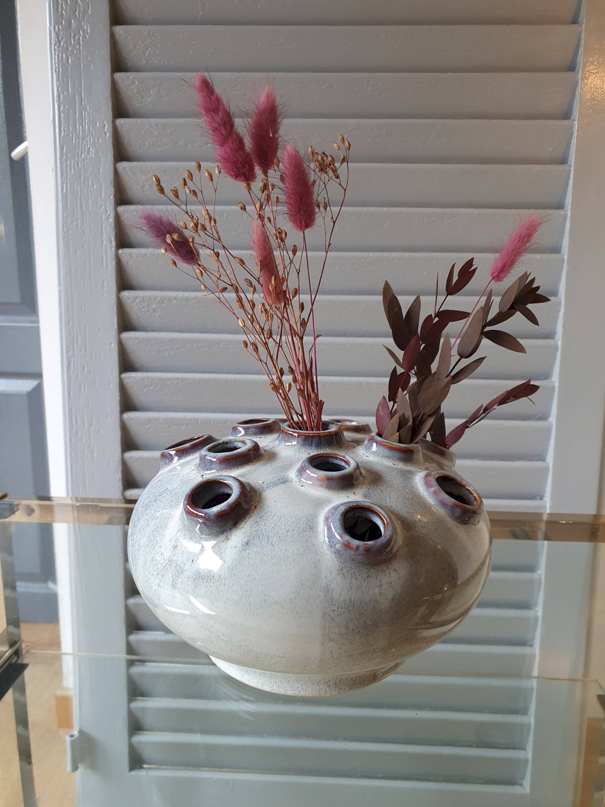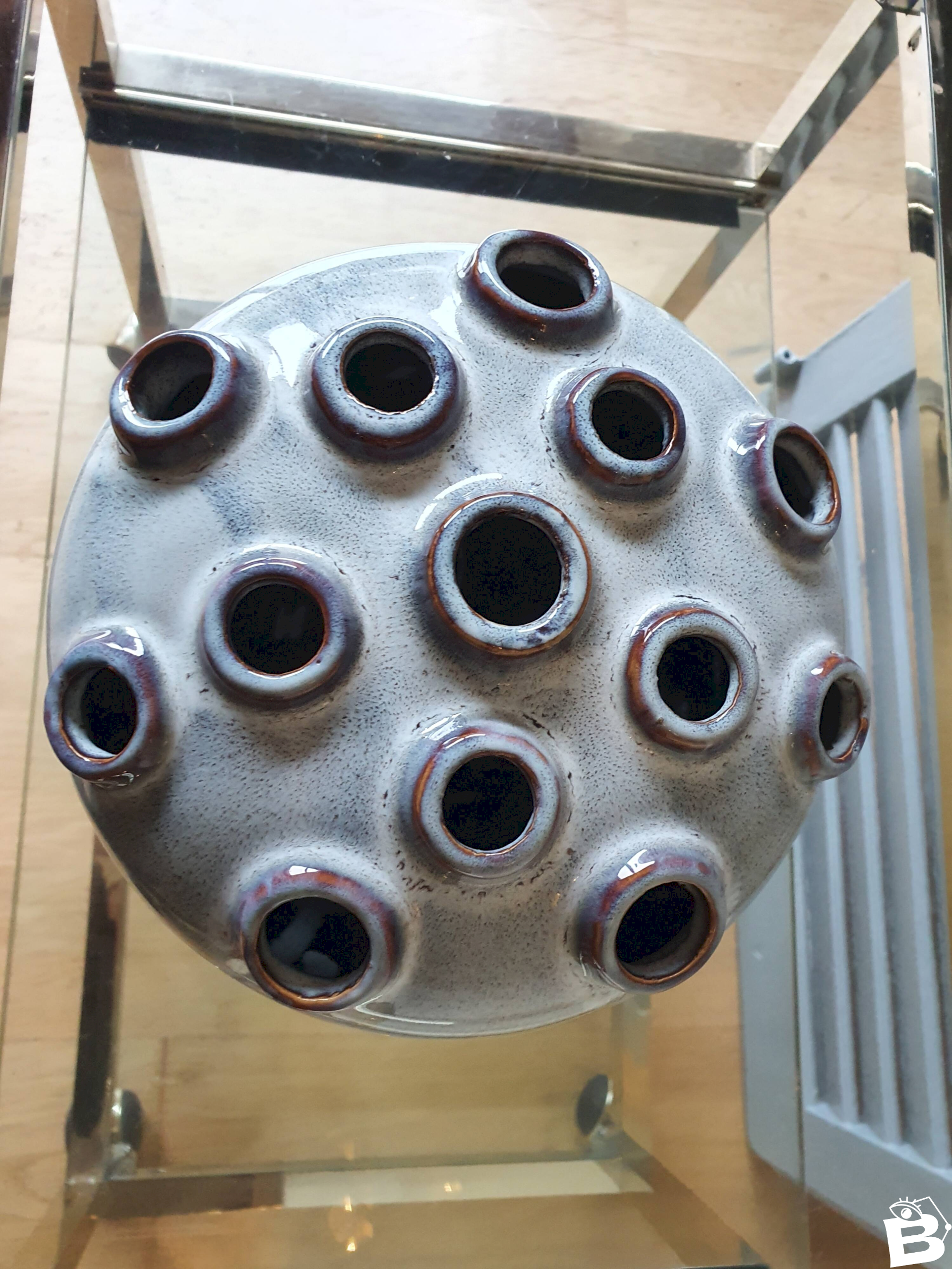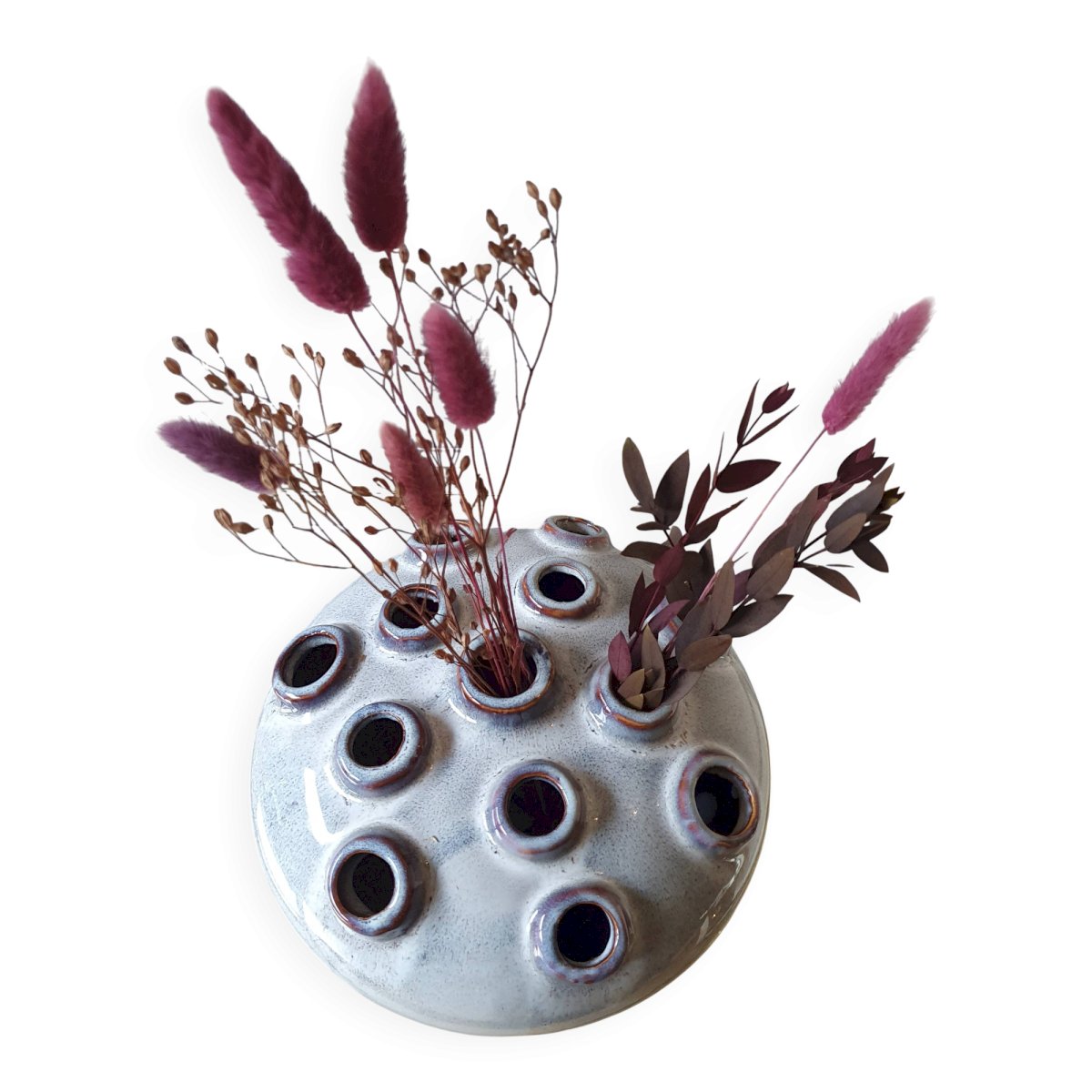 Gros pique-fleurs en céramique, l'émaillage est dans les tons gris bleus avec coulures.