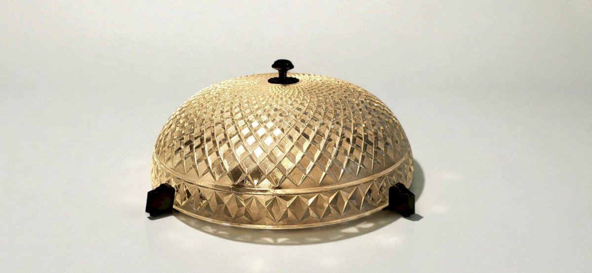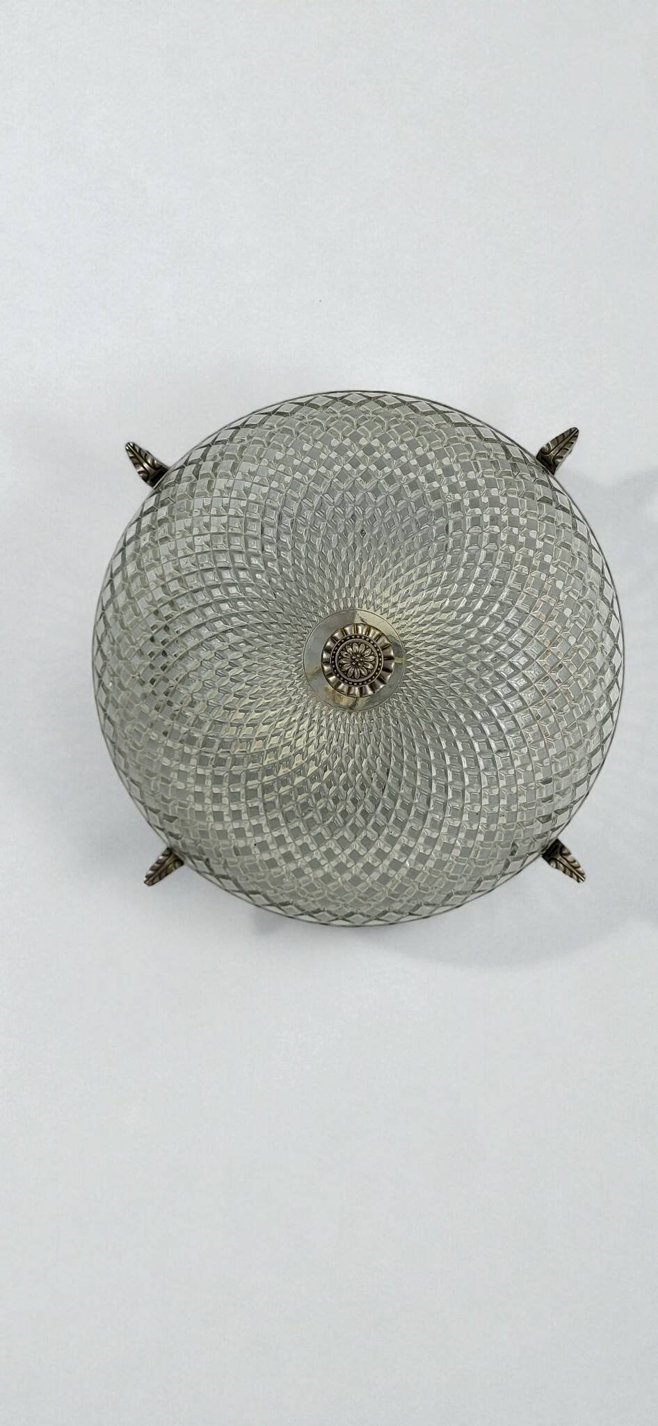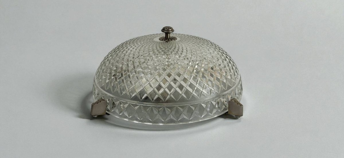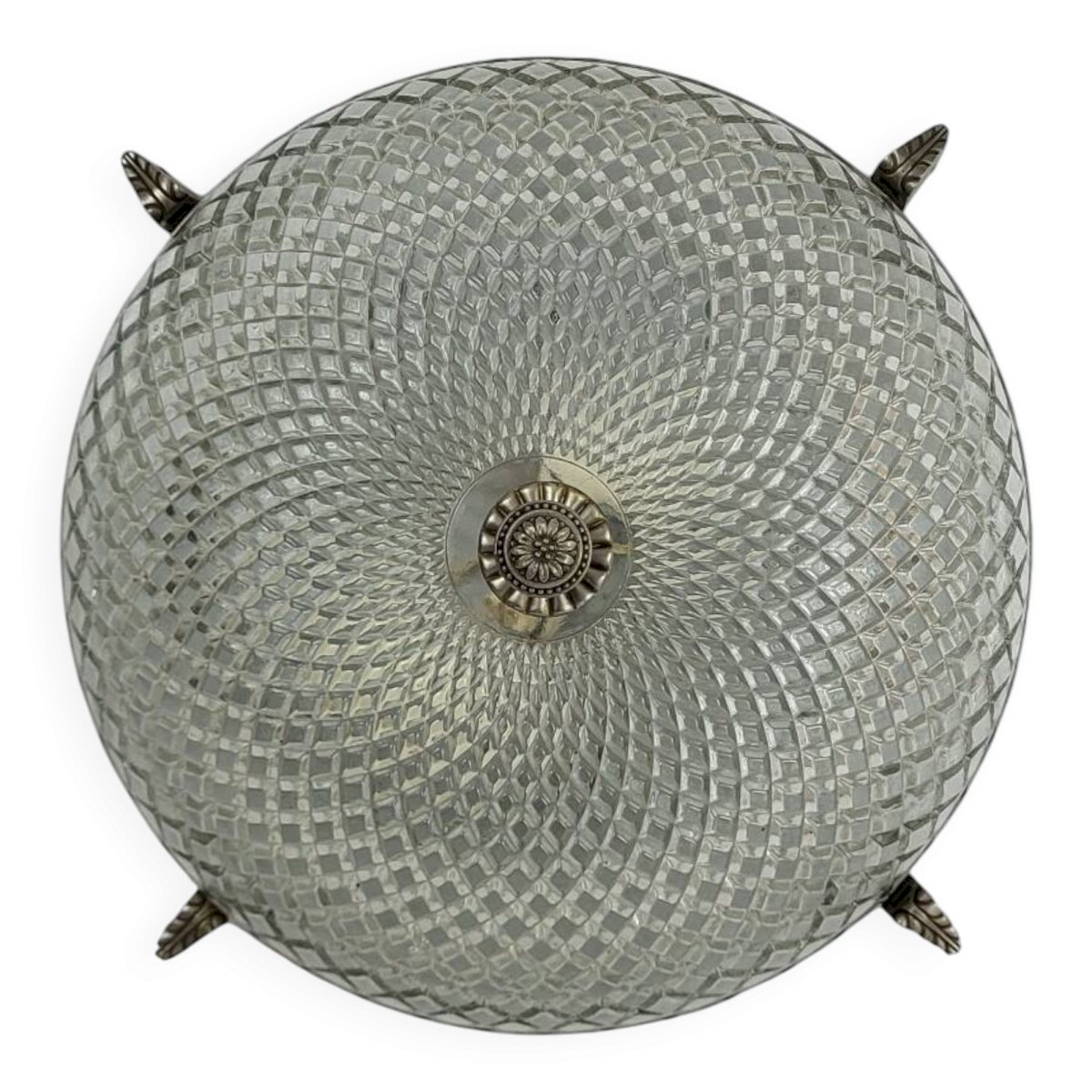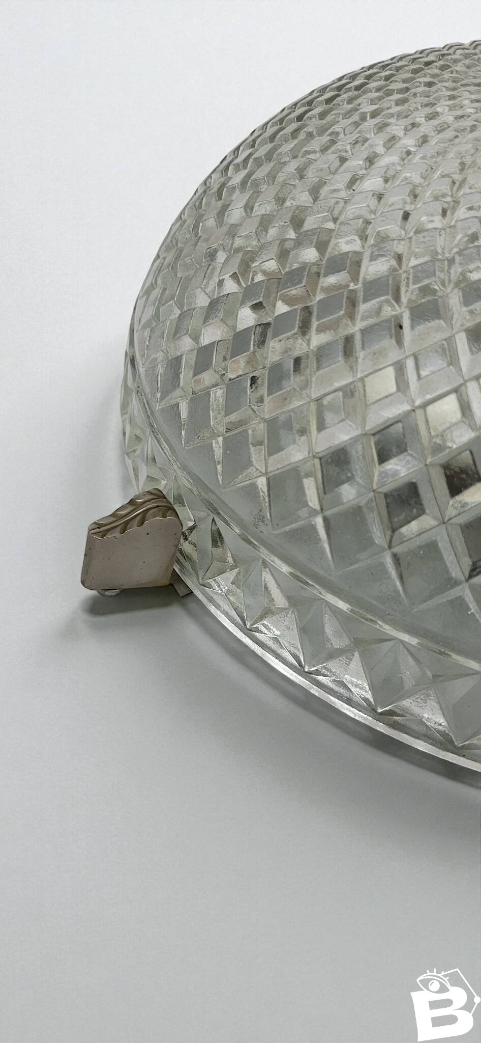 Plafonnier en verre et métal nickelé, Années 70.Diamètre sans les accroches 30 cm.Hauteur 14 cm.Poids 3, 2 Kg.En bon état et fonctionnel.