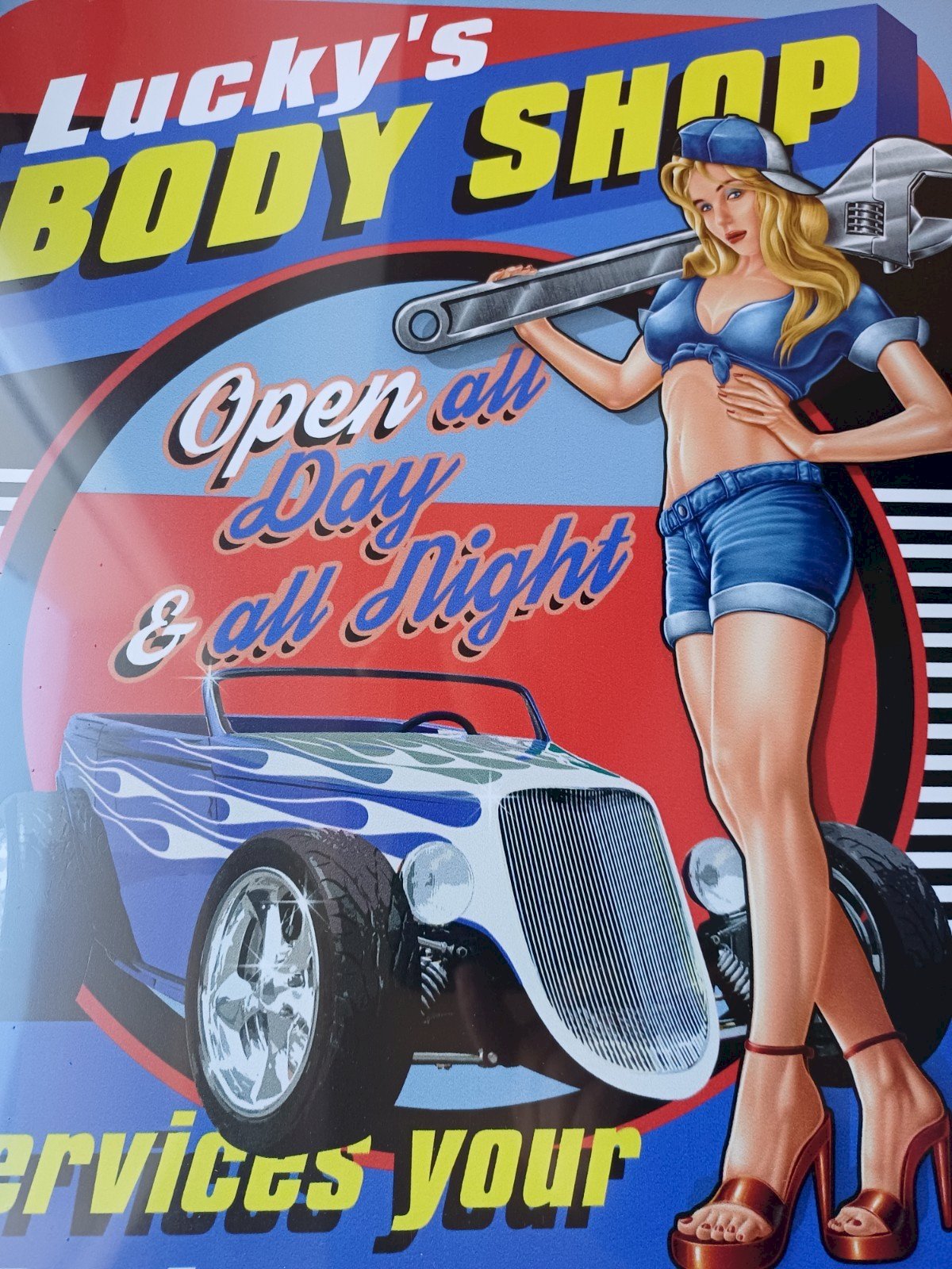 Plaque métal LUCKY'S BODY SHOP hot rod pin up 40 x 30 cm déco USA