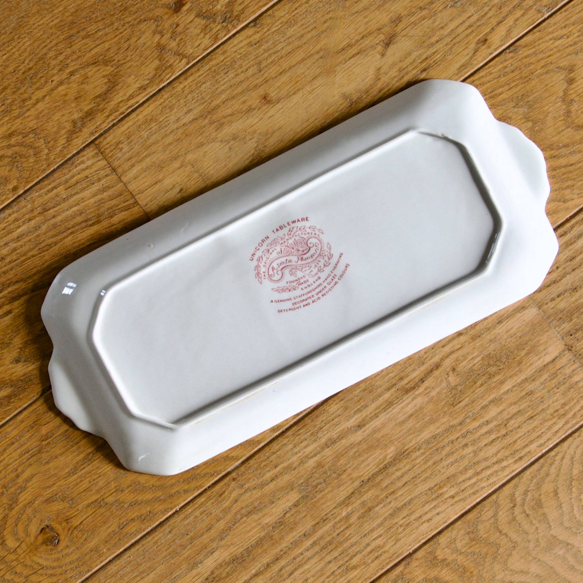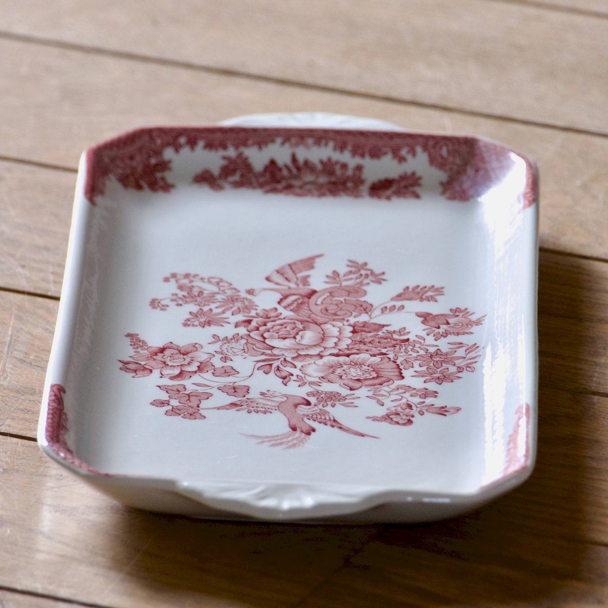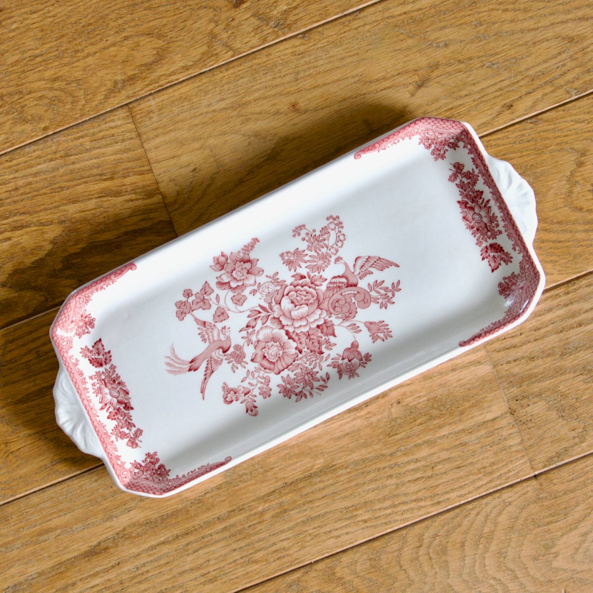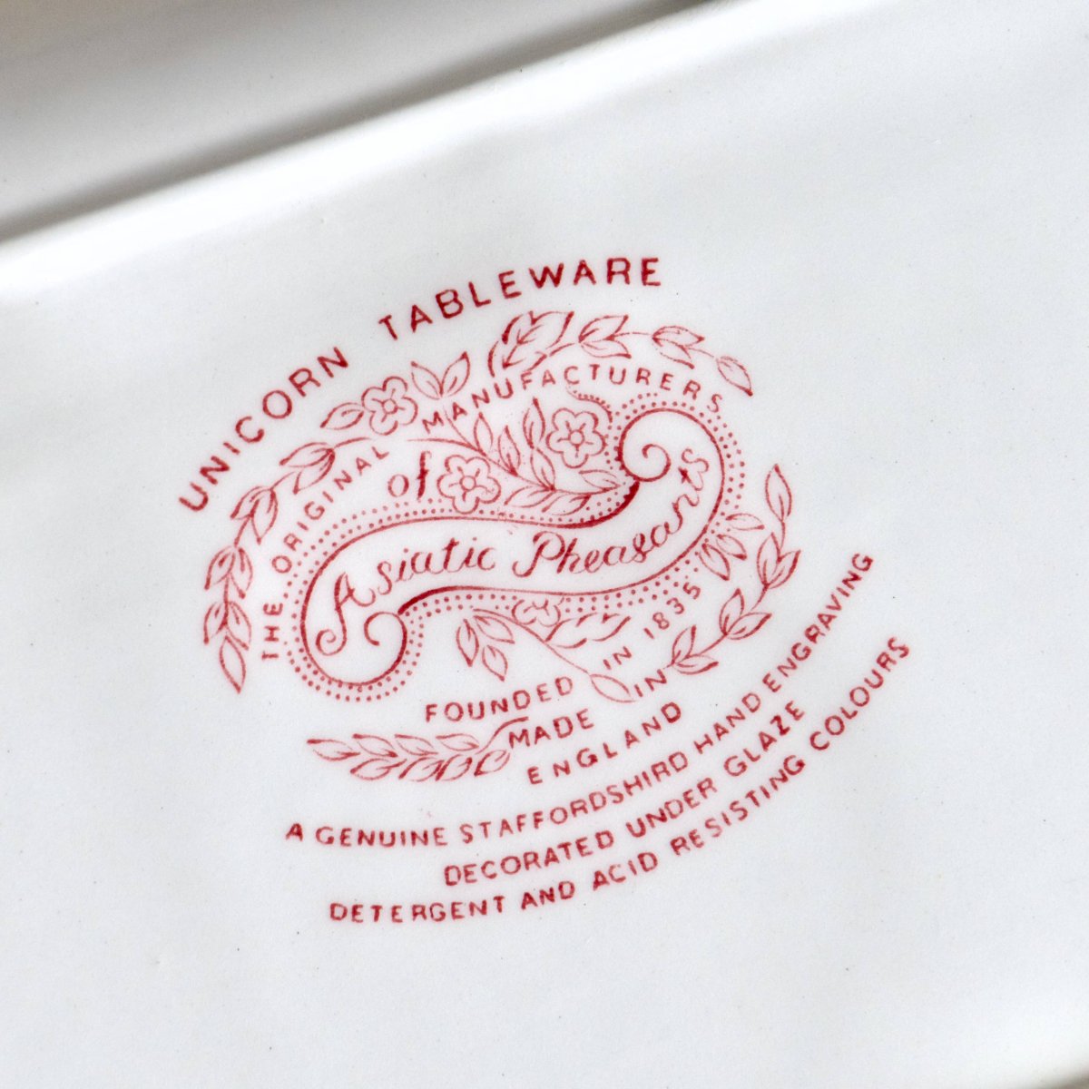 Merveilleux plat à cake en faïence anglaise rose / rouge, estampillé Staffordshire Unicorn, collection “Asiatic Pheasants”, de style victorien.Décor entièrement gravé à la main, faisans en vol autour de fleurs et autres végétations.
