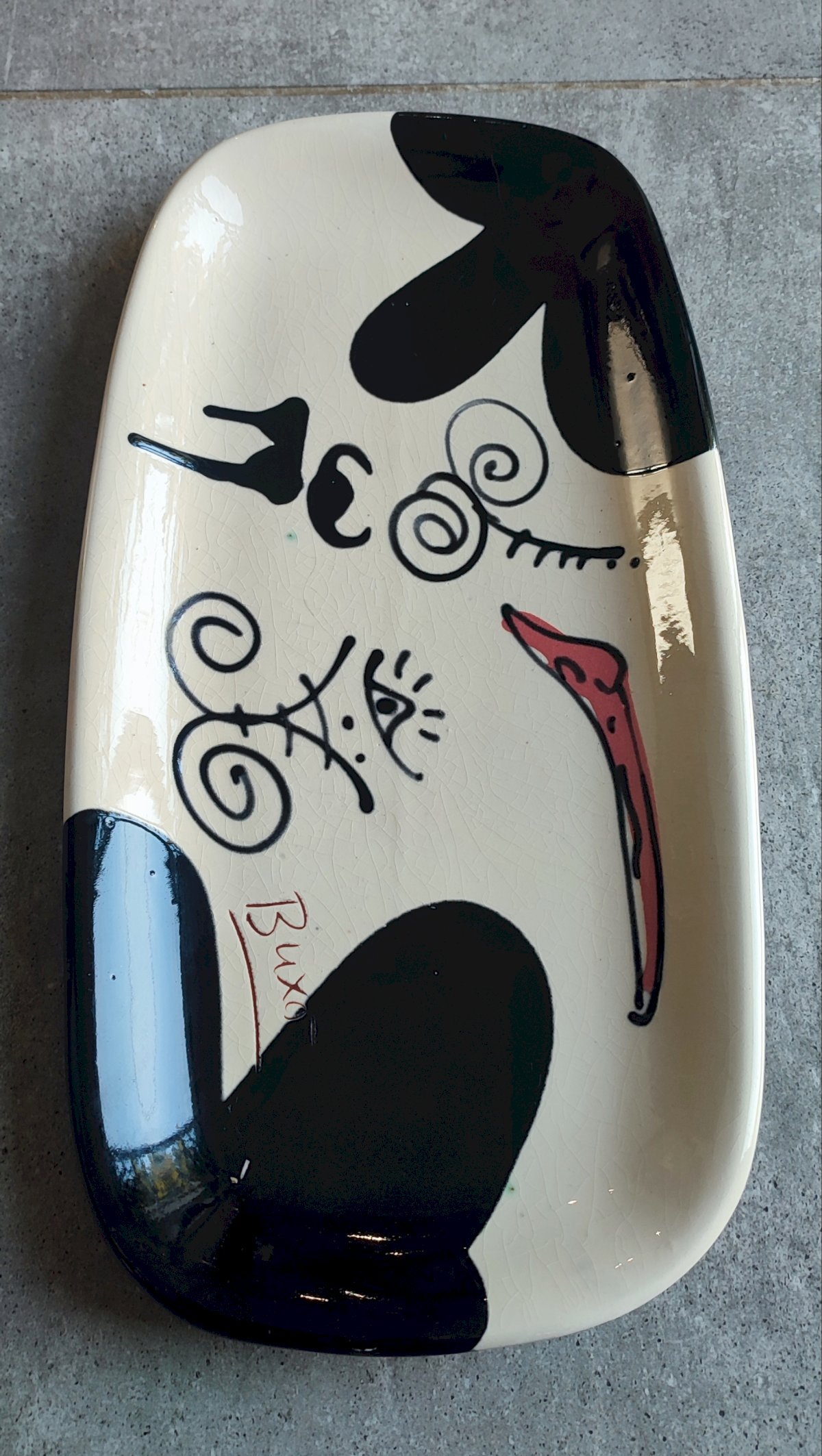 Grand plat allongé en céramique émaillée signé Buxó (Thomas Buxó figure catalane du design et de l’art céramique contemporain , grand prix de Rome en 1996 ). La pièce a été réalisée dans l’atelier espagnol Atzana (signature sous la base)réputé et spécialisé dans les pièces modernistes de qualité.