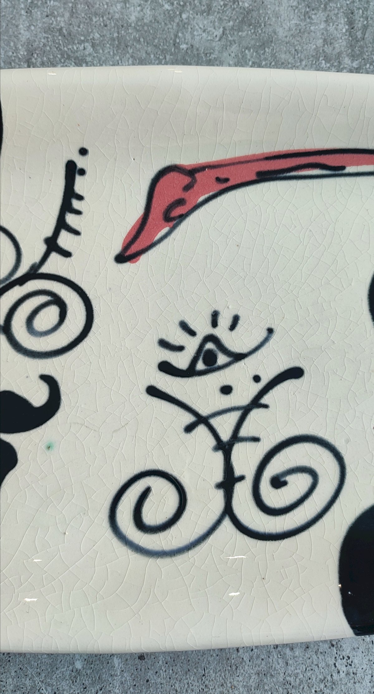 Cette pièce se distingue par son décor abstrait graphique , son taureau stylisé , ses jeux de lignes noires et ses touches de rouge sur un fond crème lumineux.