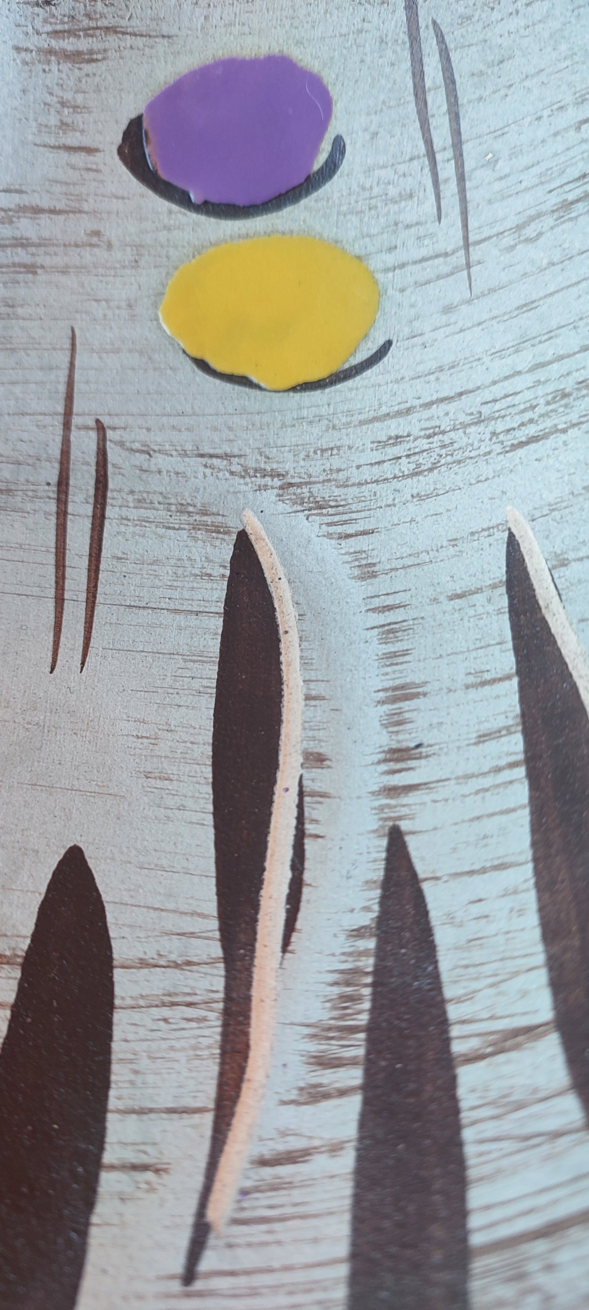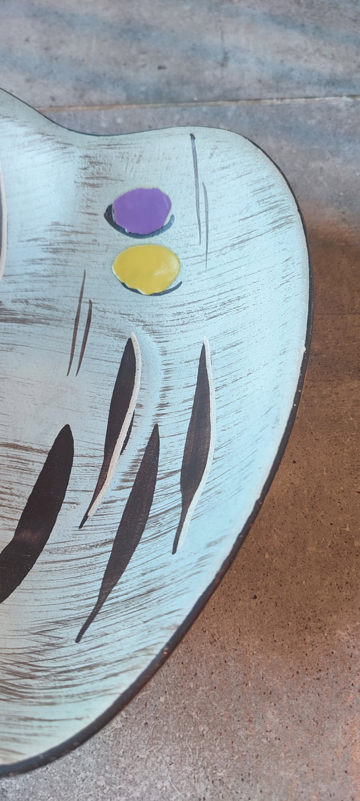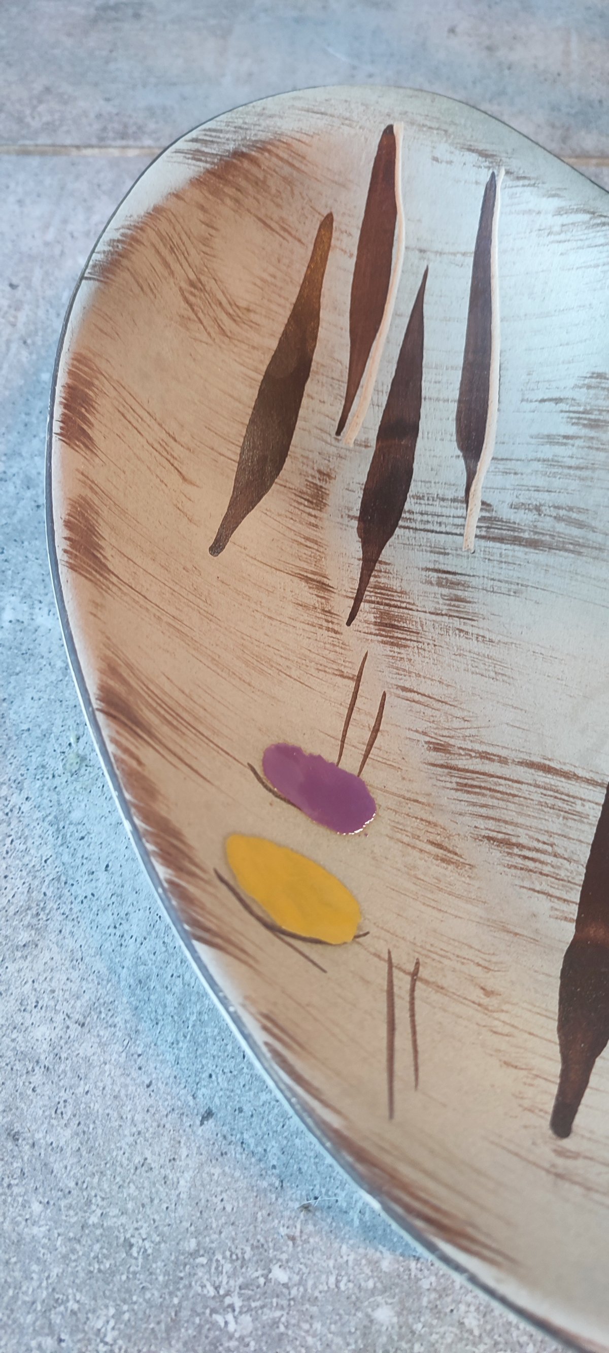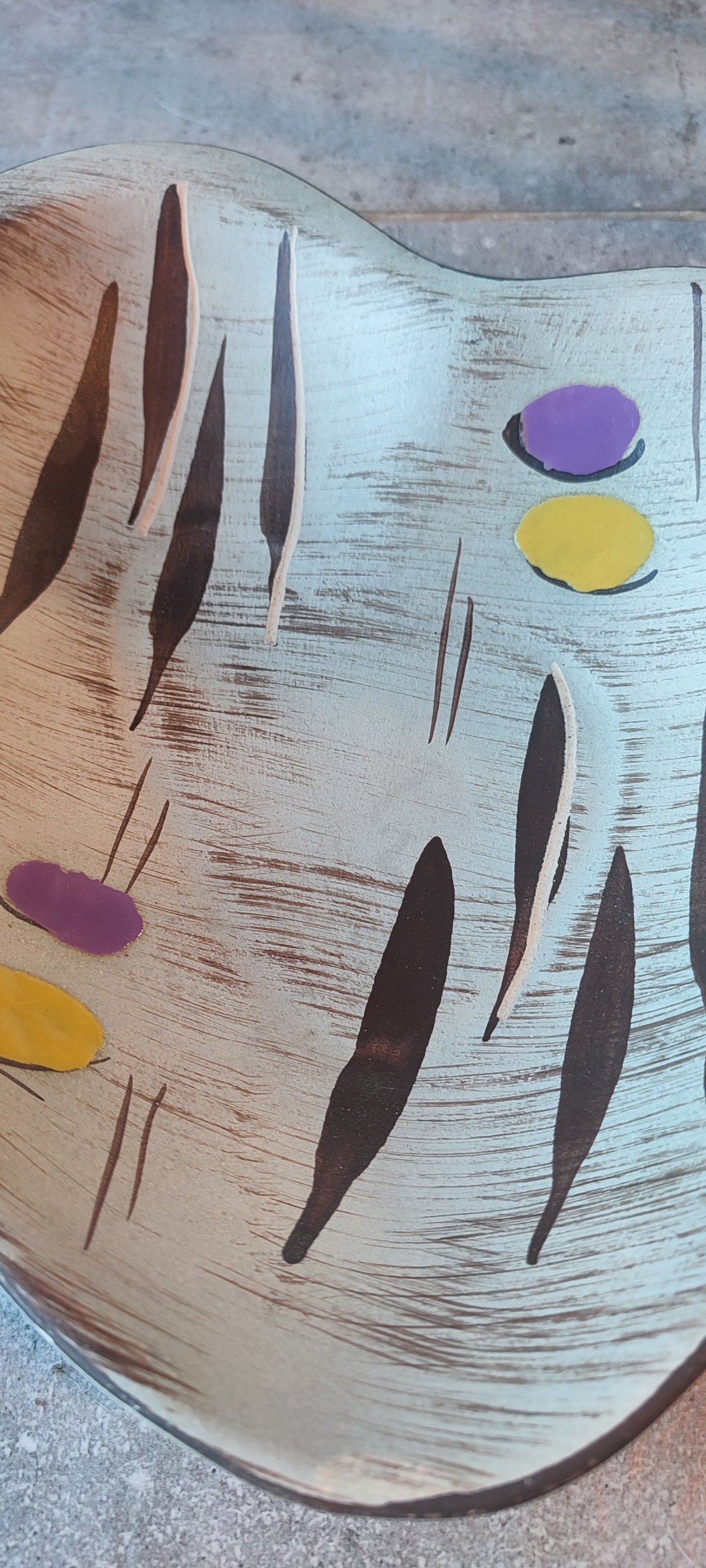 Plat en céramique marqué WEST-GERMANY numéroté 444 au design freeform typique des années 50/60. Sa forme organique , son décor abstrait et ses touches émaillées brillantes légèrement en relief jaune et violette , lui donnent un style très graphique et résolument mid-century modern.
