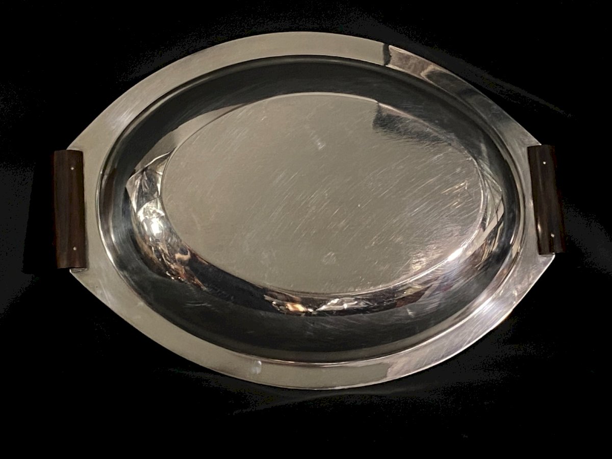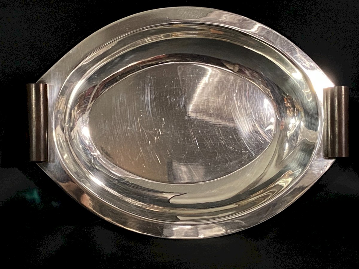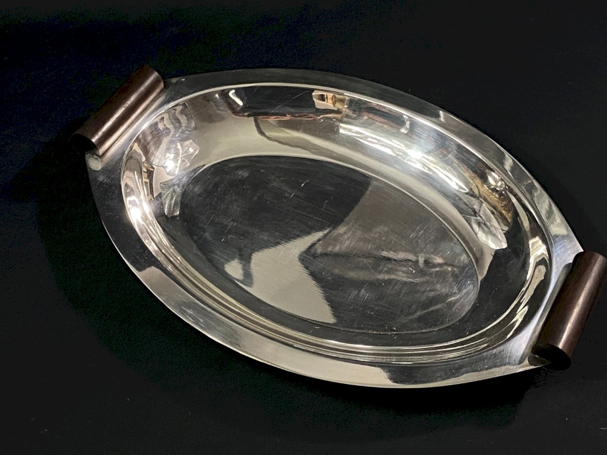 Plat creux de forme ovale en métal argenté et anses bois type macassar Art déco
