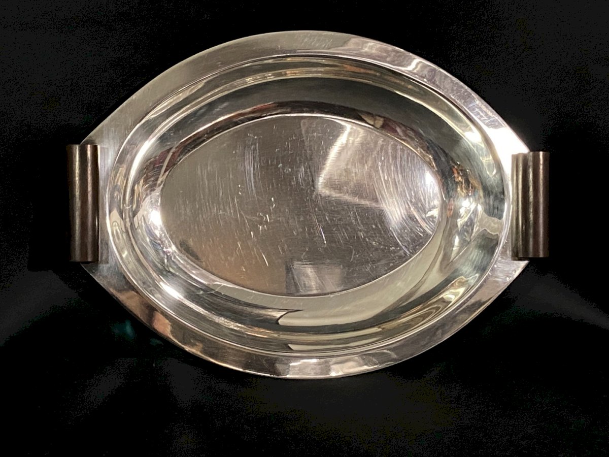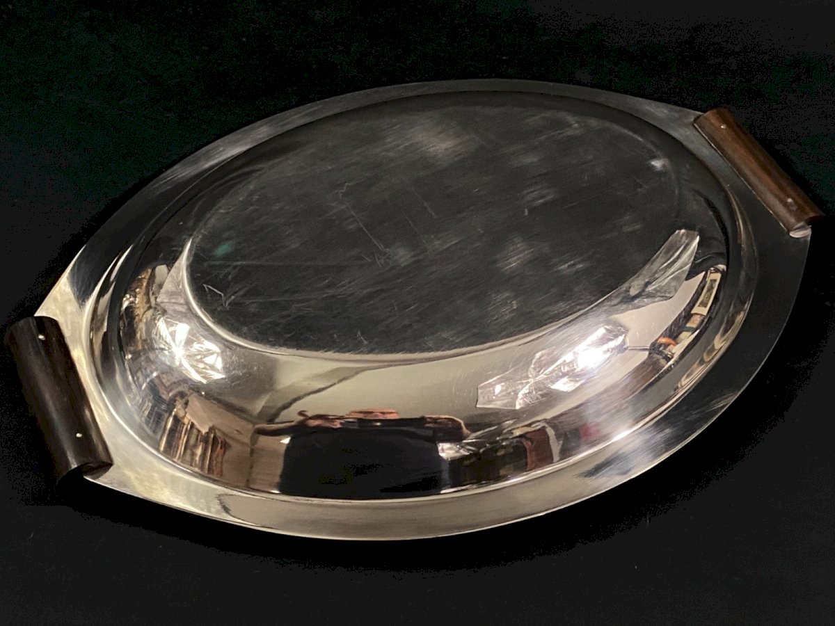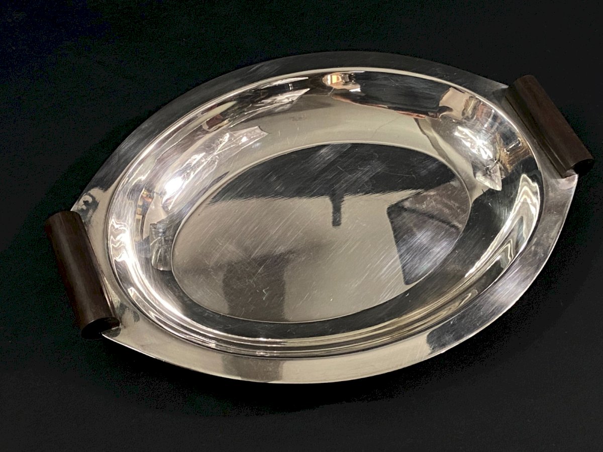 Plat creux de forme ovale en métal argenté et anses bois type macassar Art déco