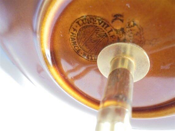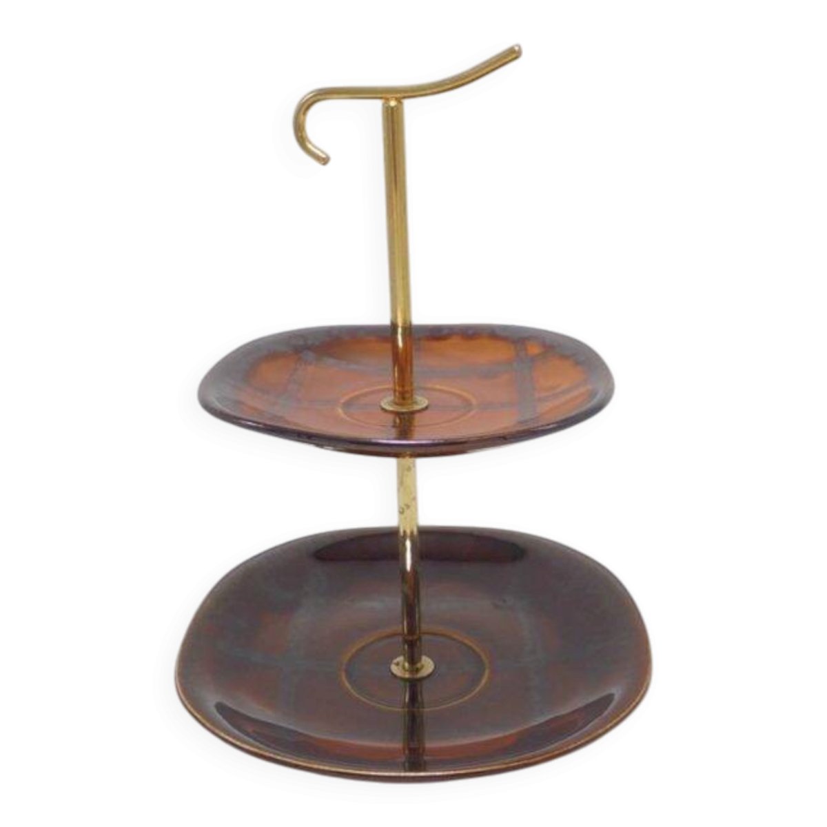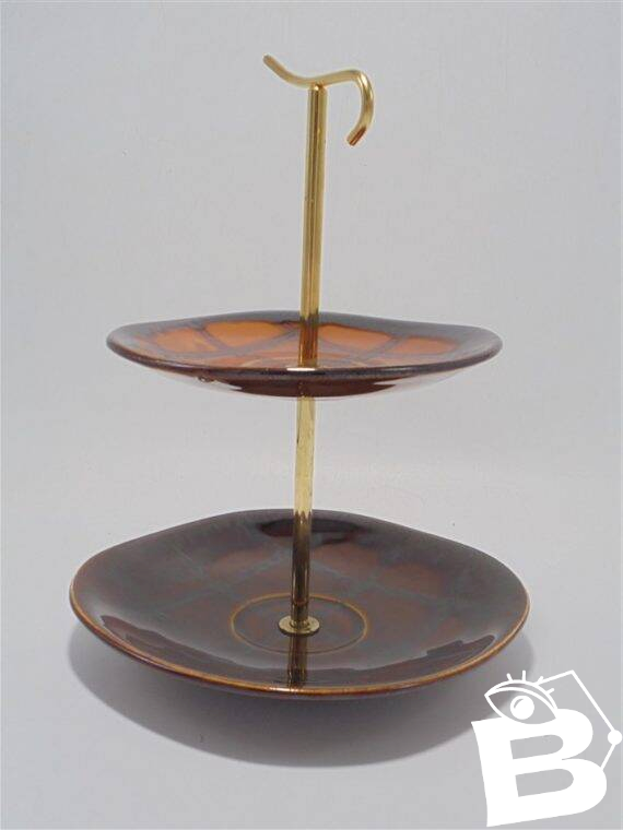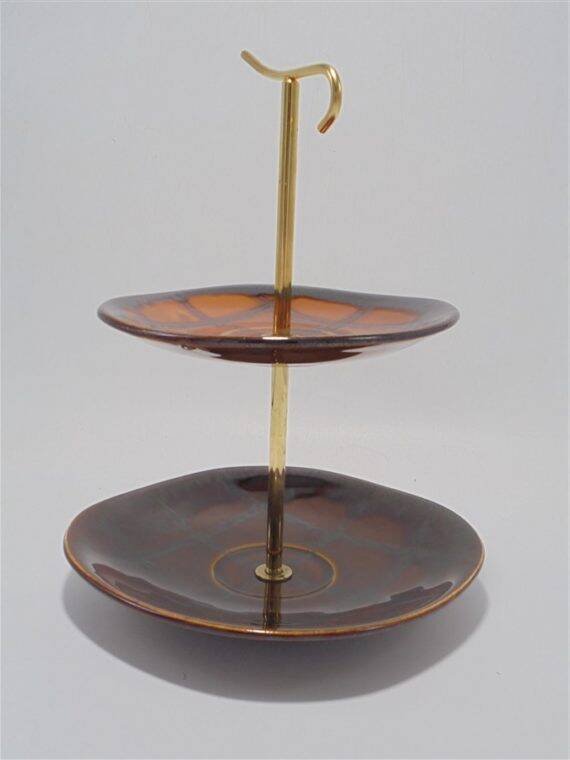 Plat de service Lunéville Badonviller France, à étage, en céramique marron.Largeurs des plateaux: 17 et 13.5 cm.Hauteur totale: 22.5 cm.Poids: 420 g.