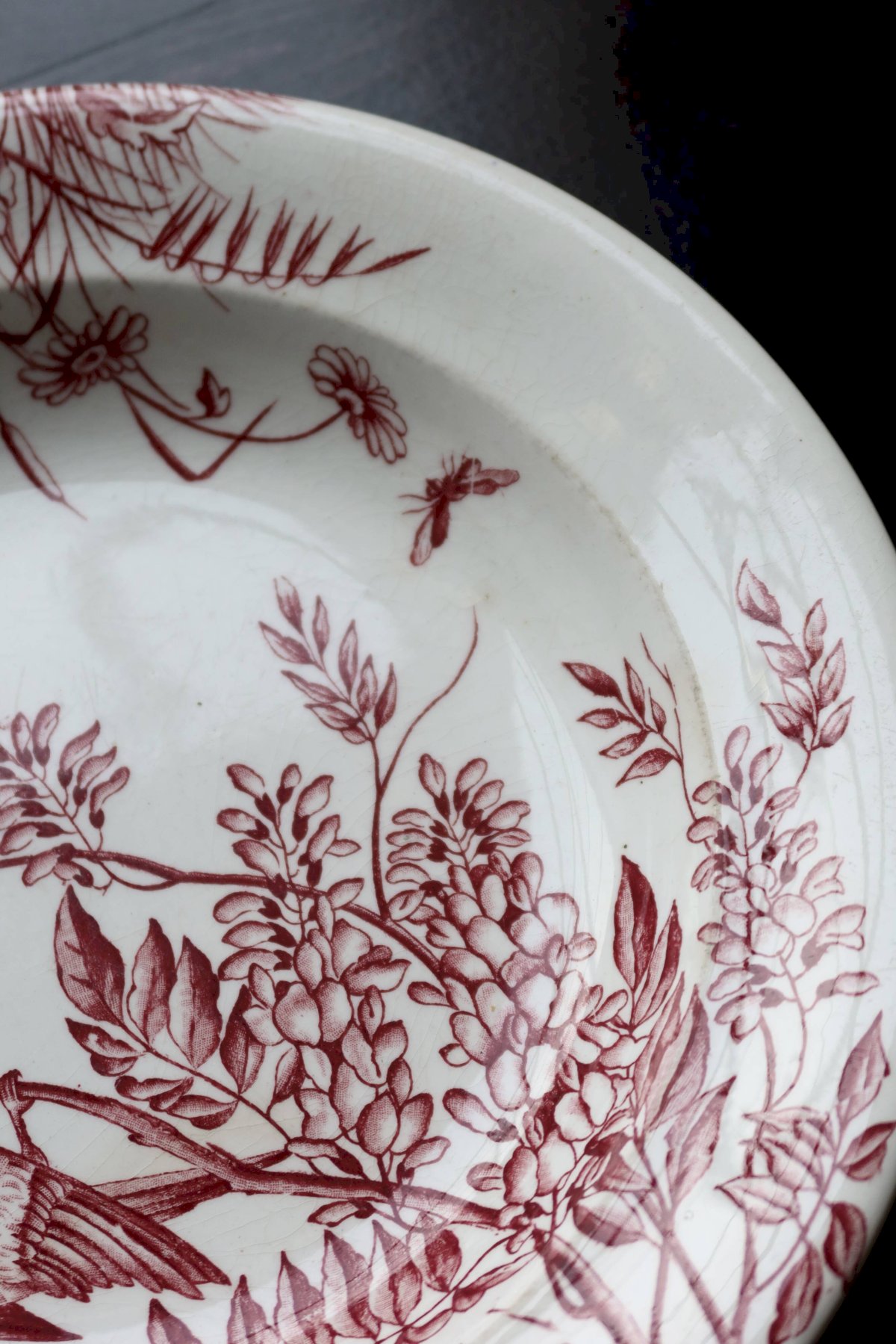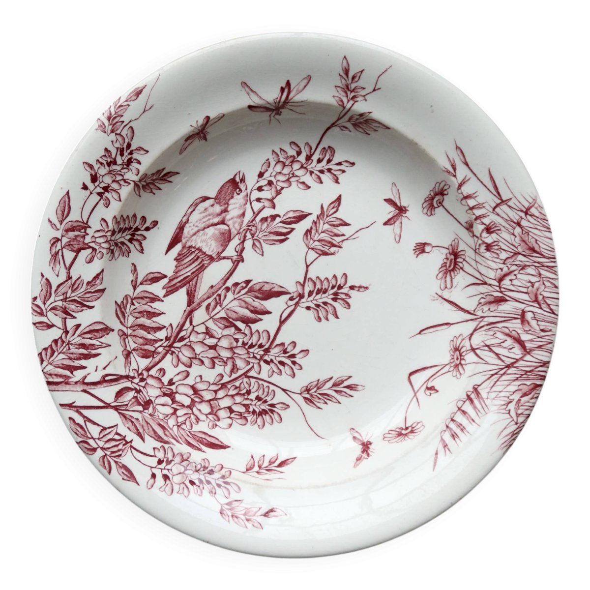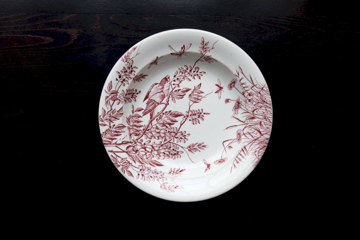 Plat de service rond ancien terre de fer S&G - Décor oiseaux et végétation Rouge Céramique