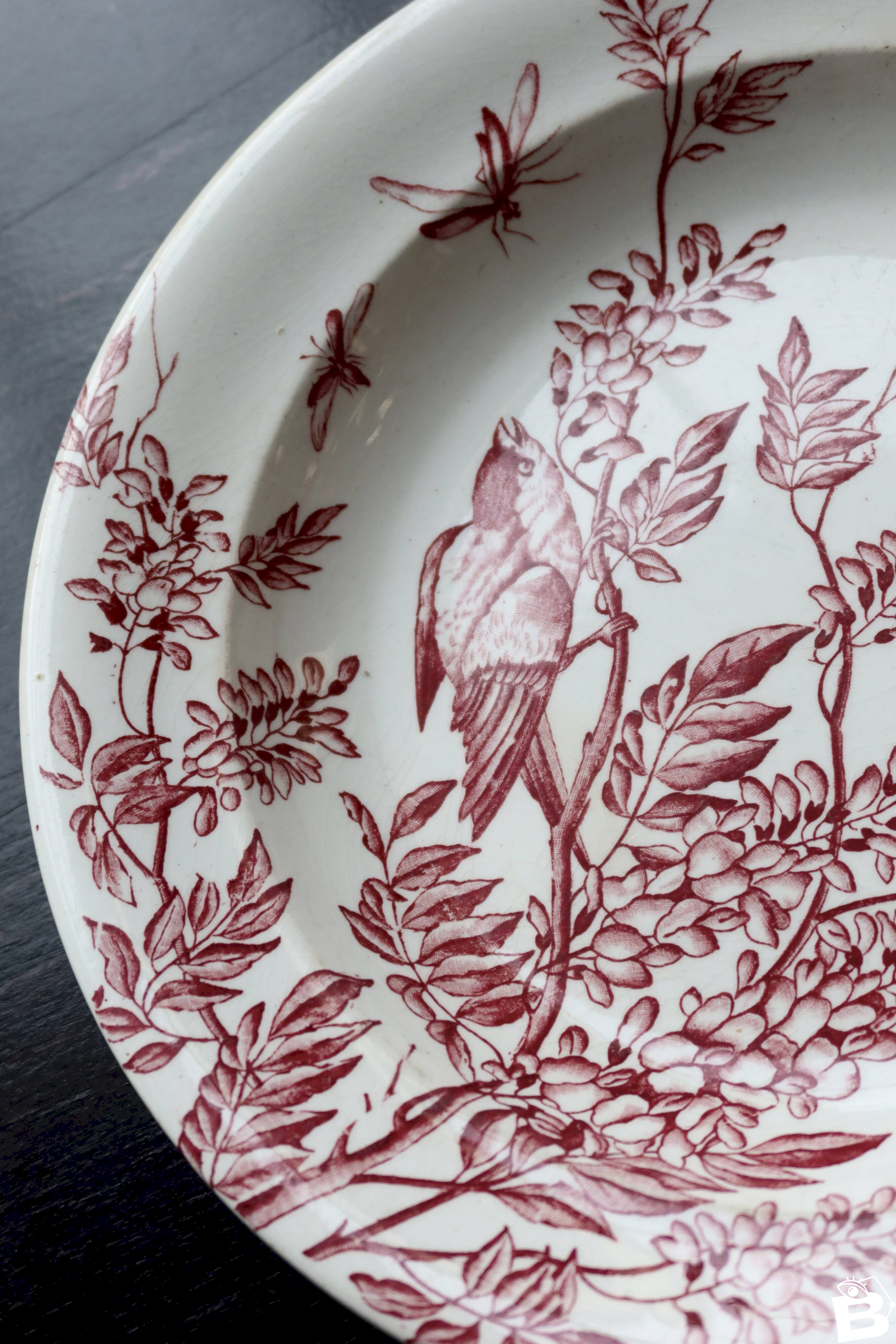 Très beau plat de service rond et creux ancien estampillée S & G, décoré d’un motif d’oiseaux et de feuillage rouge dans un esprit naturaliste.