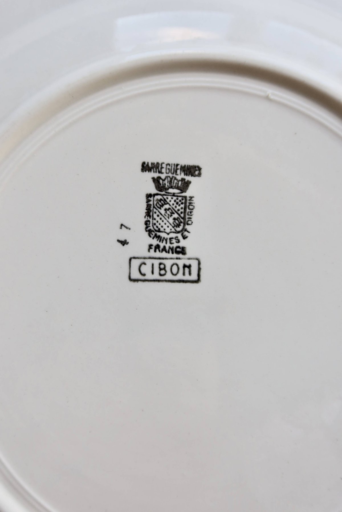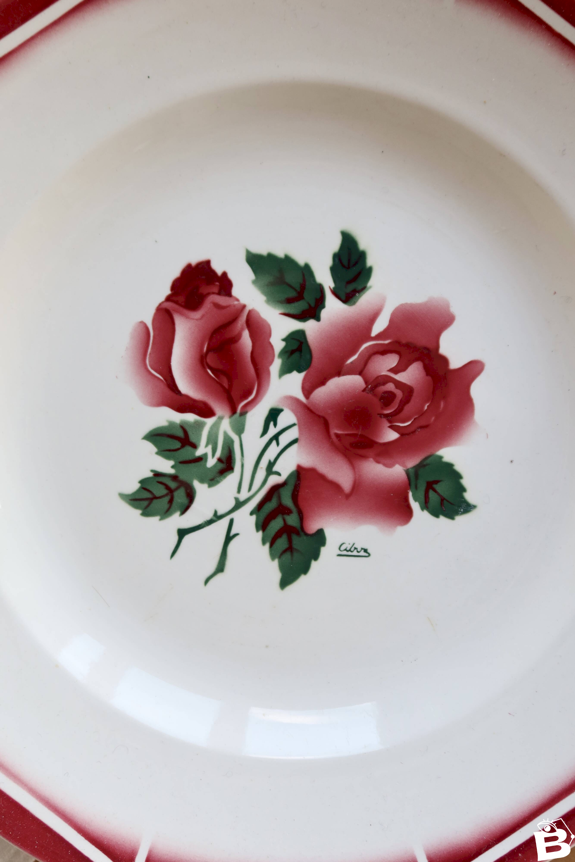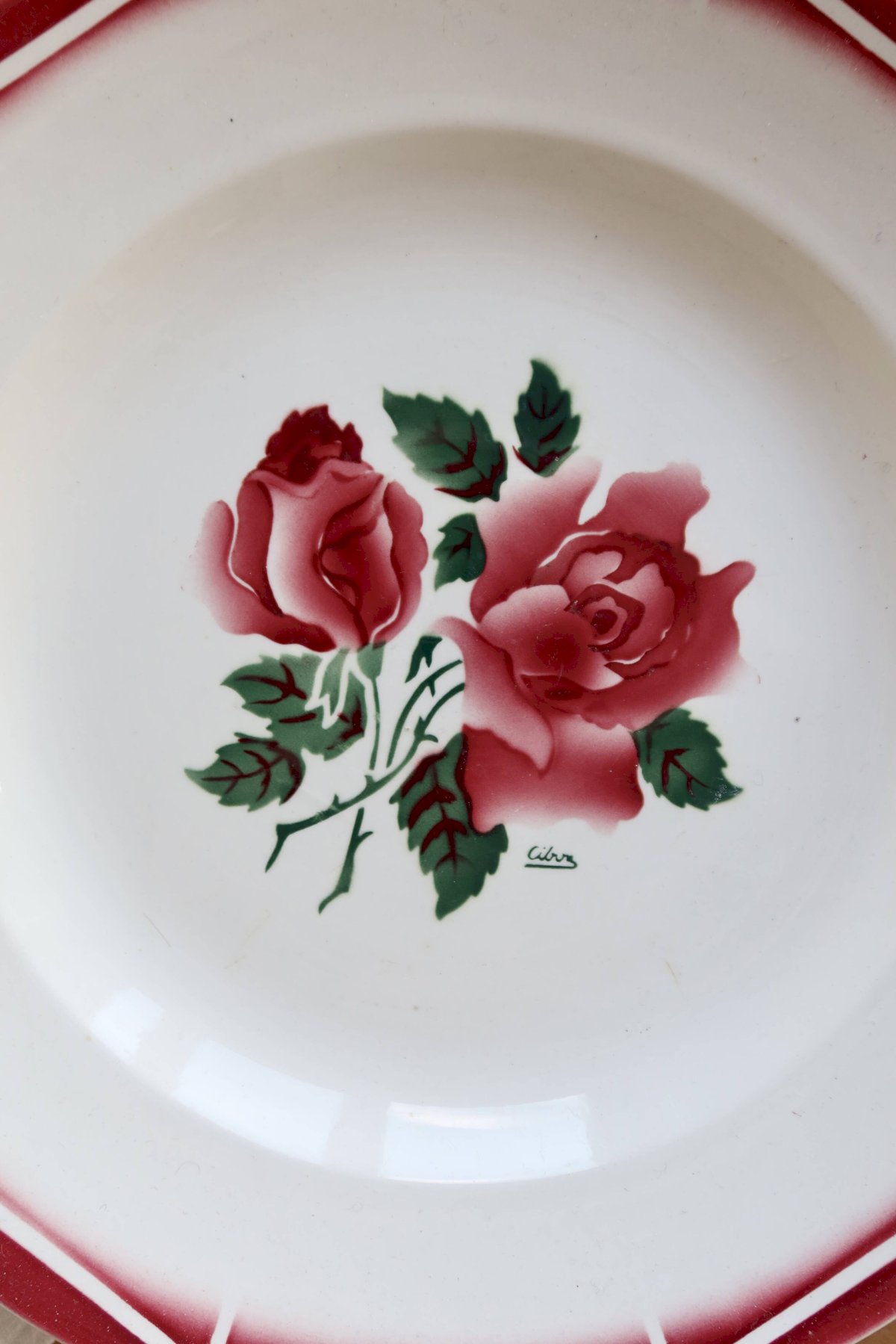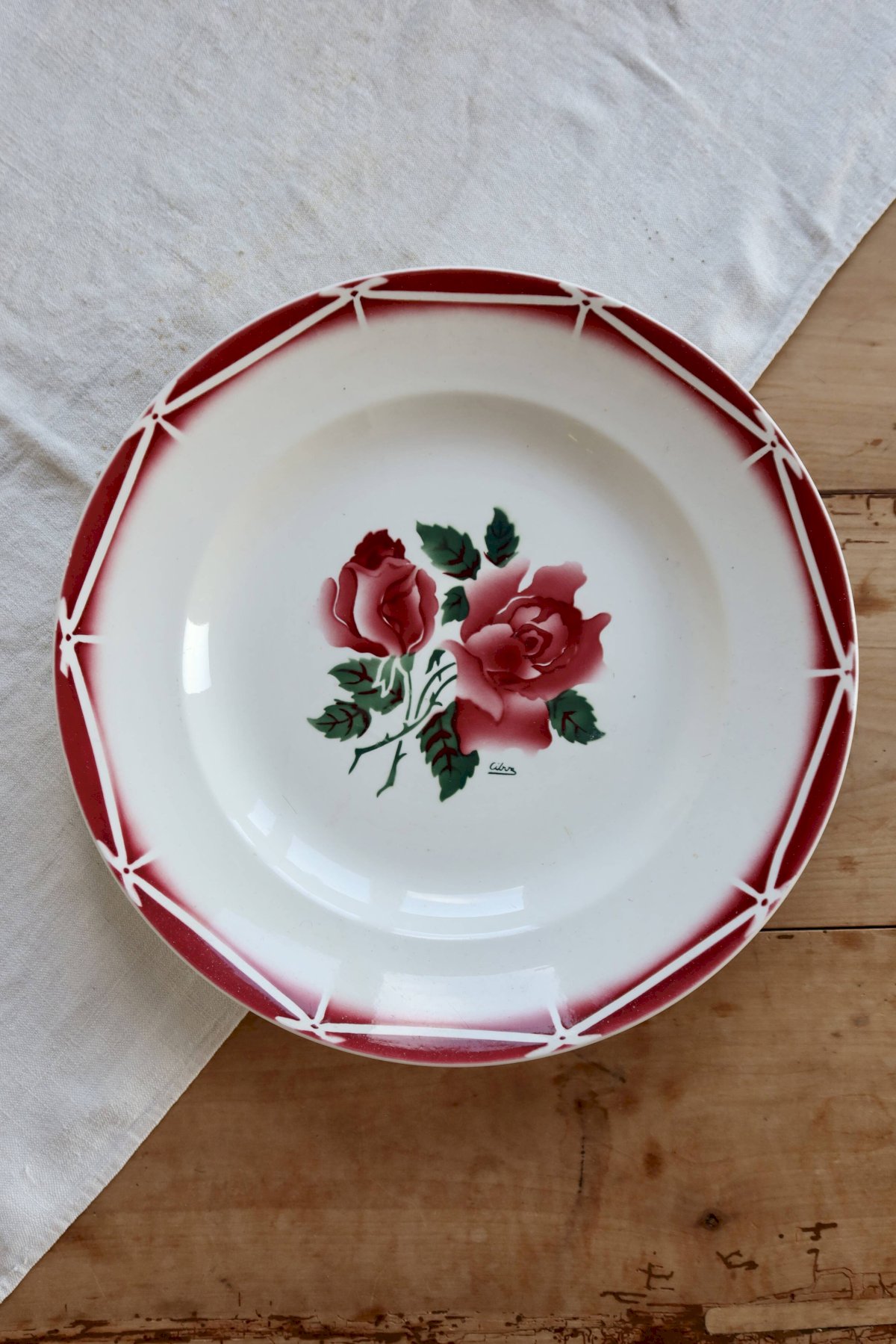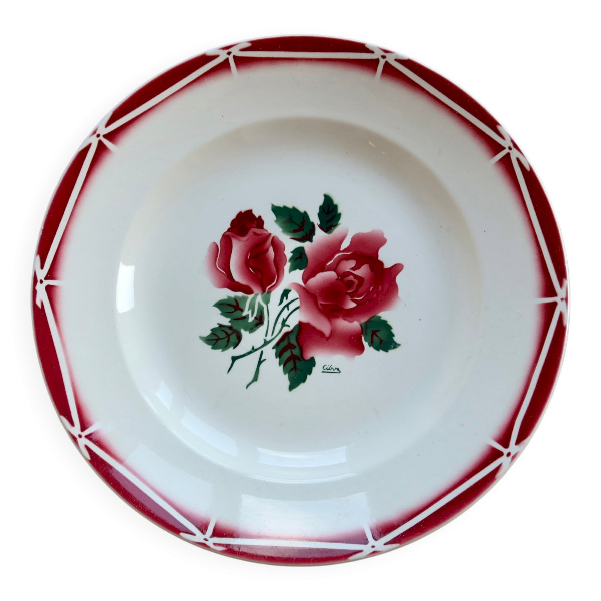 Plat de service rond en faïence Sarreguemines modèle Cibon, décoré de roses rouges en son centre et souligné par une frise géométrique rouge typique du modèle.