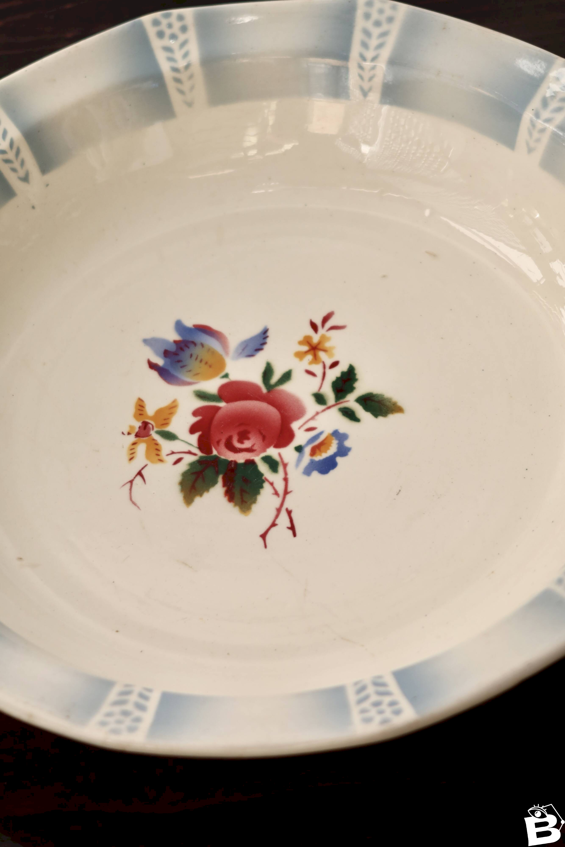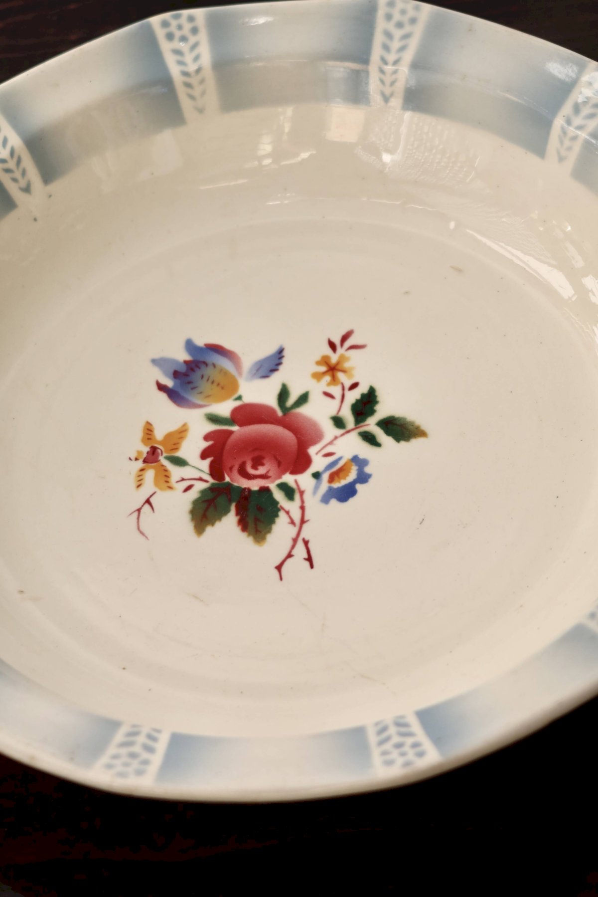 Plat de service rond et creux en faïence de Sarreguemines, modèle Claude, décor floral central aux tons délicats et frise bleu pâle en bordure.