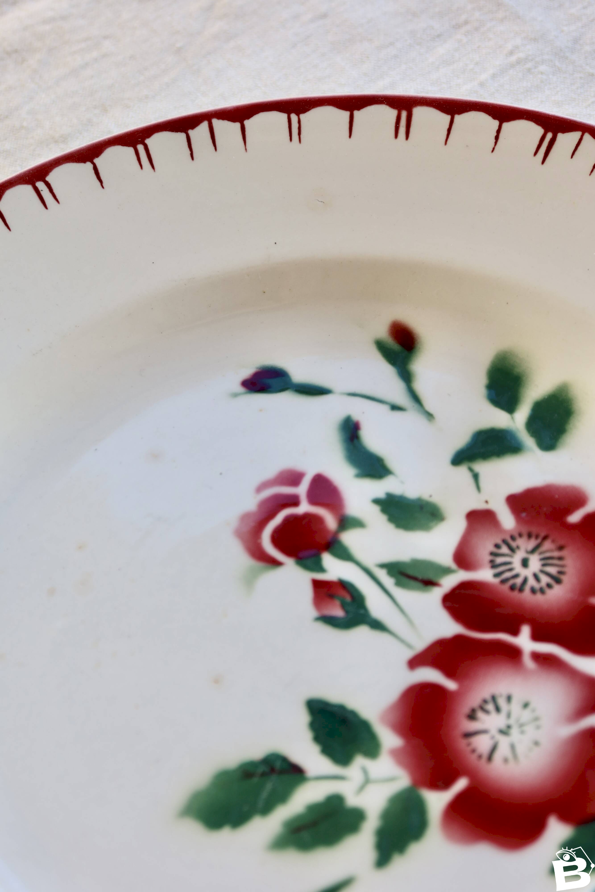 Son bord souligné de traits rouges et son décor fleuri en font une pièce élégante pour présenter desserts, fruits ou petits plats sur une table vintage.Bel état avec traces d’usage et légère patine du temps.Dimensions: 27, 5cm X 2, 5cm.