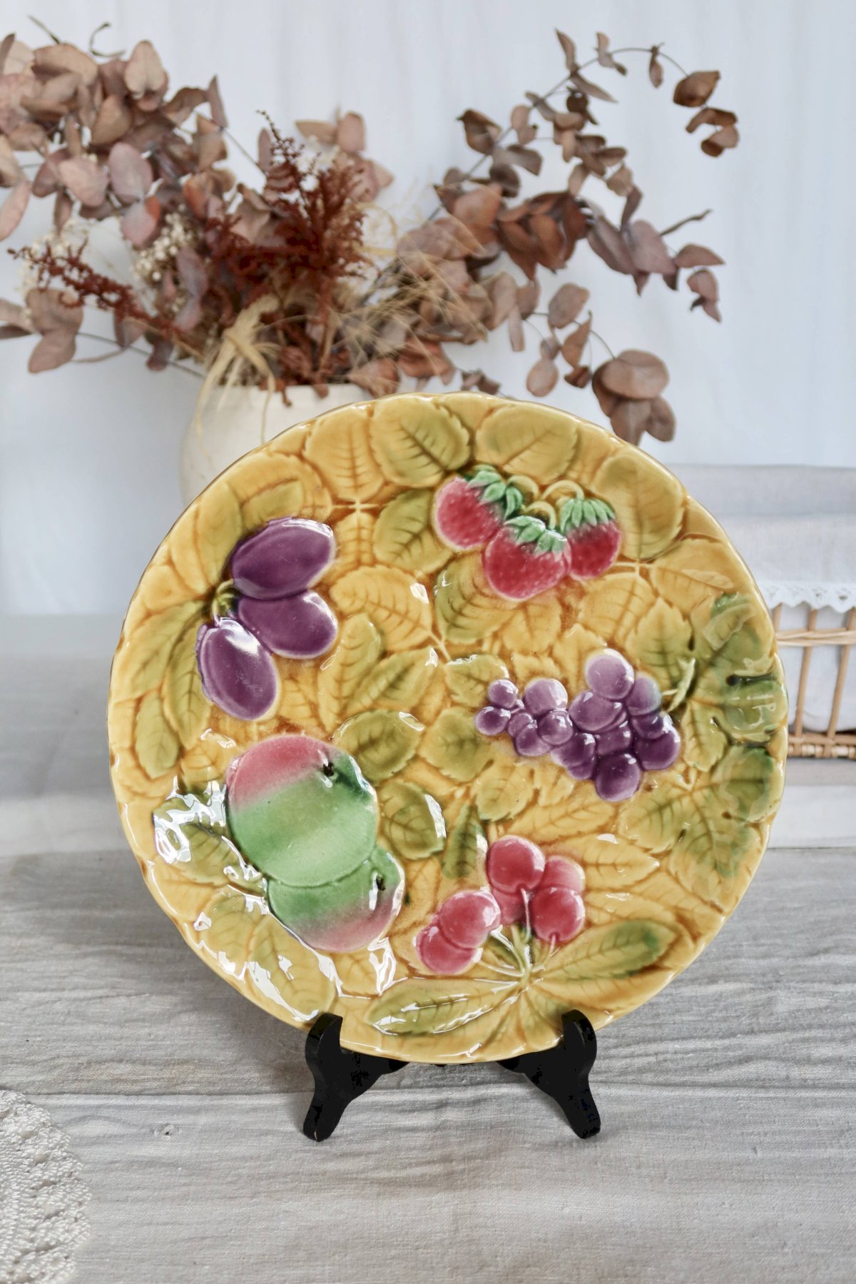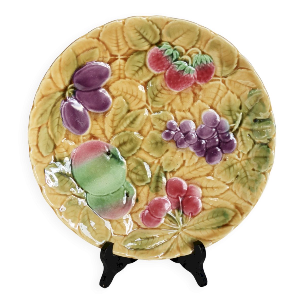 Plat à gâteau Art Déco, en céramique de Sarreguemines, barbotine aux fruits