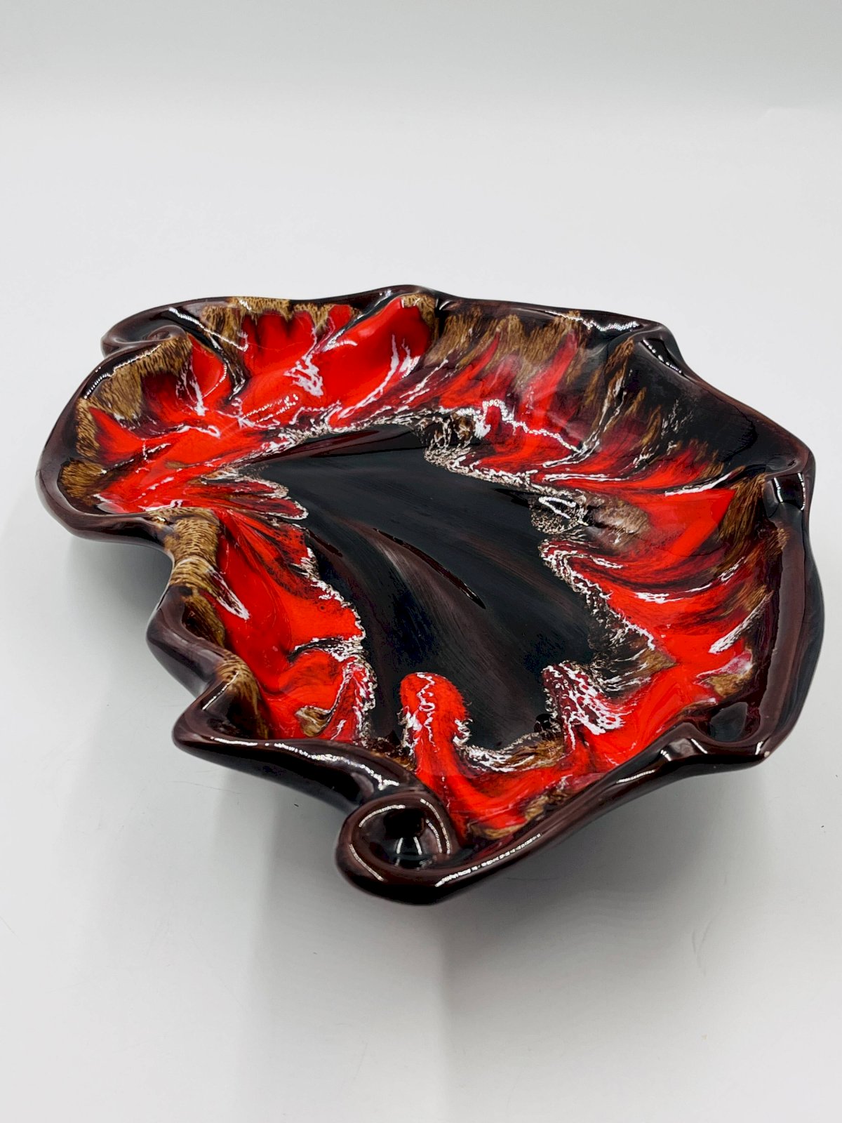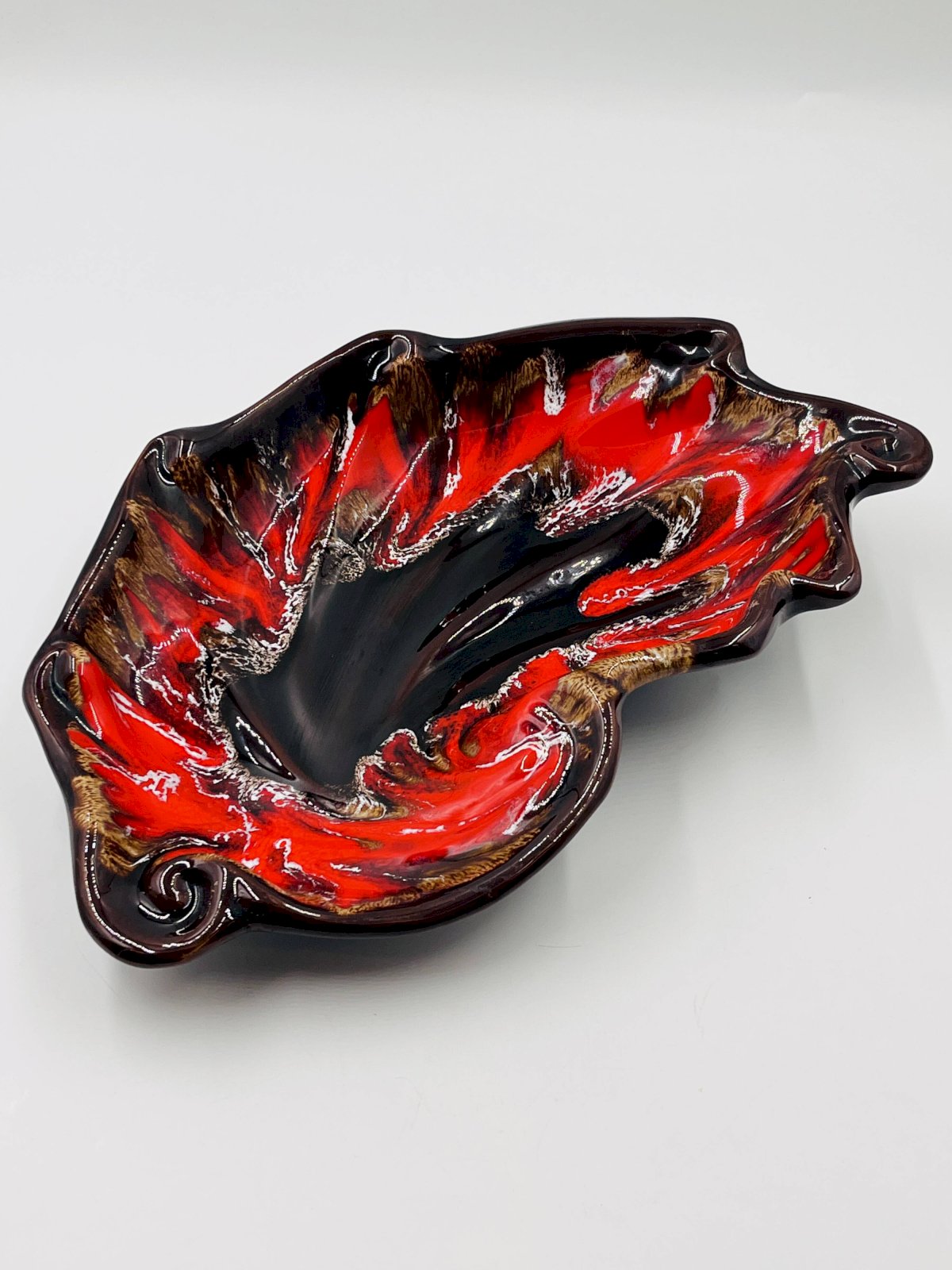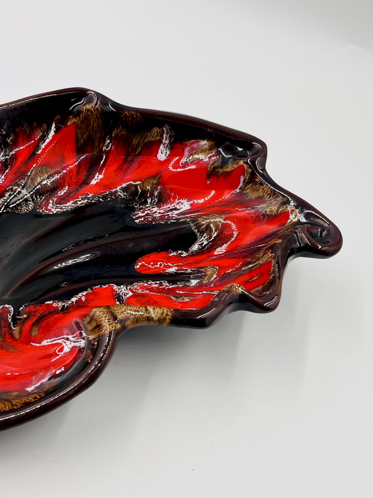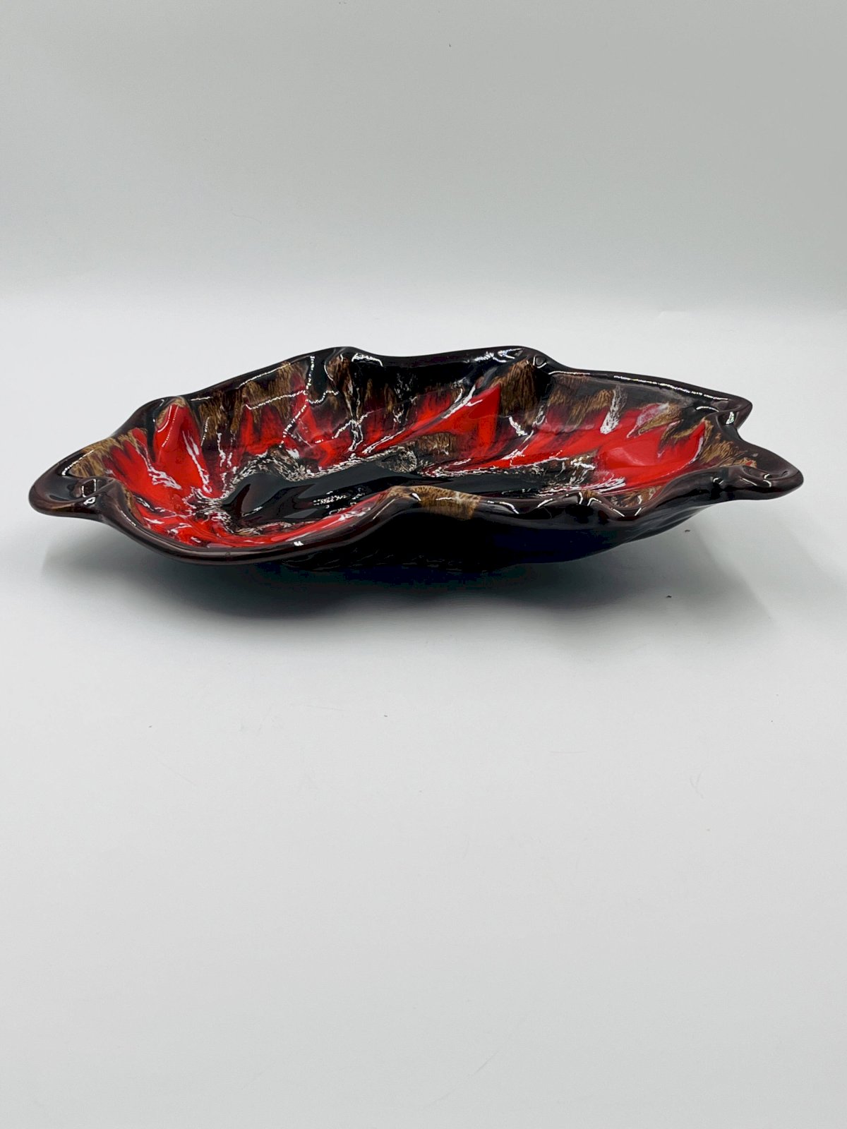 Ce plat en céramique, aux nuances vibrantes de rouge, de brun et de noir, évoque la richesse des créations artisanales du sud de la France.