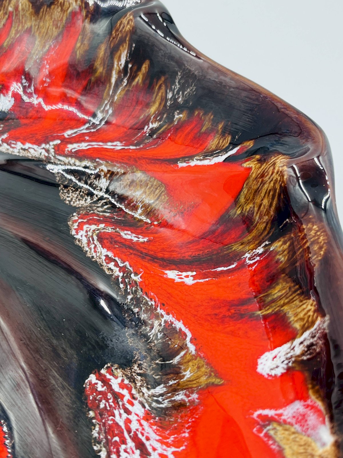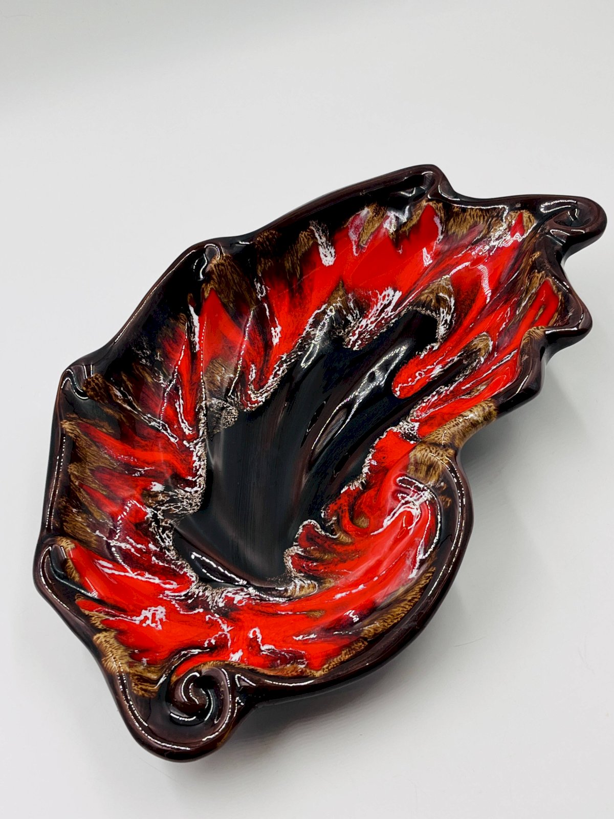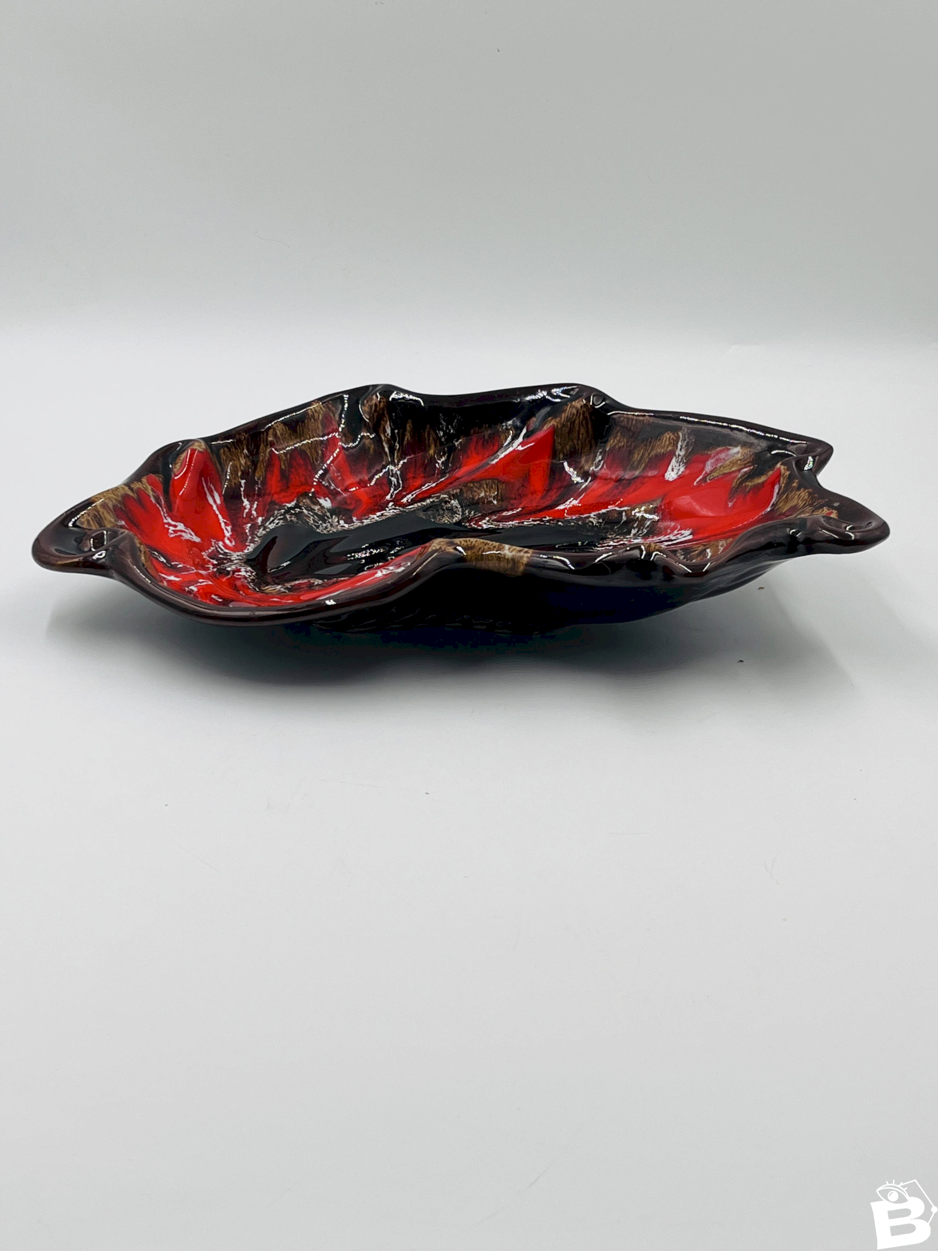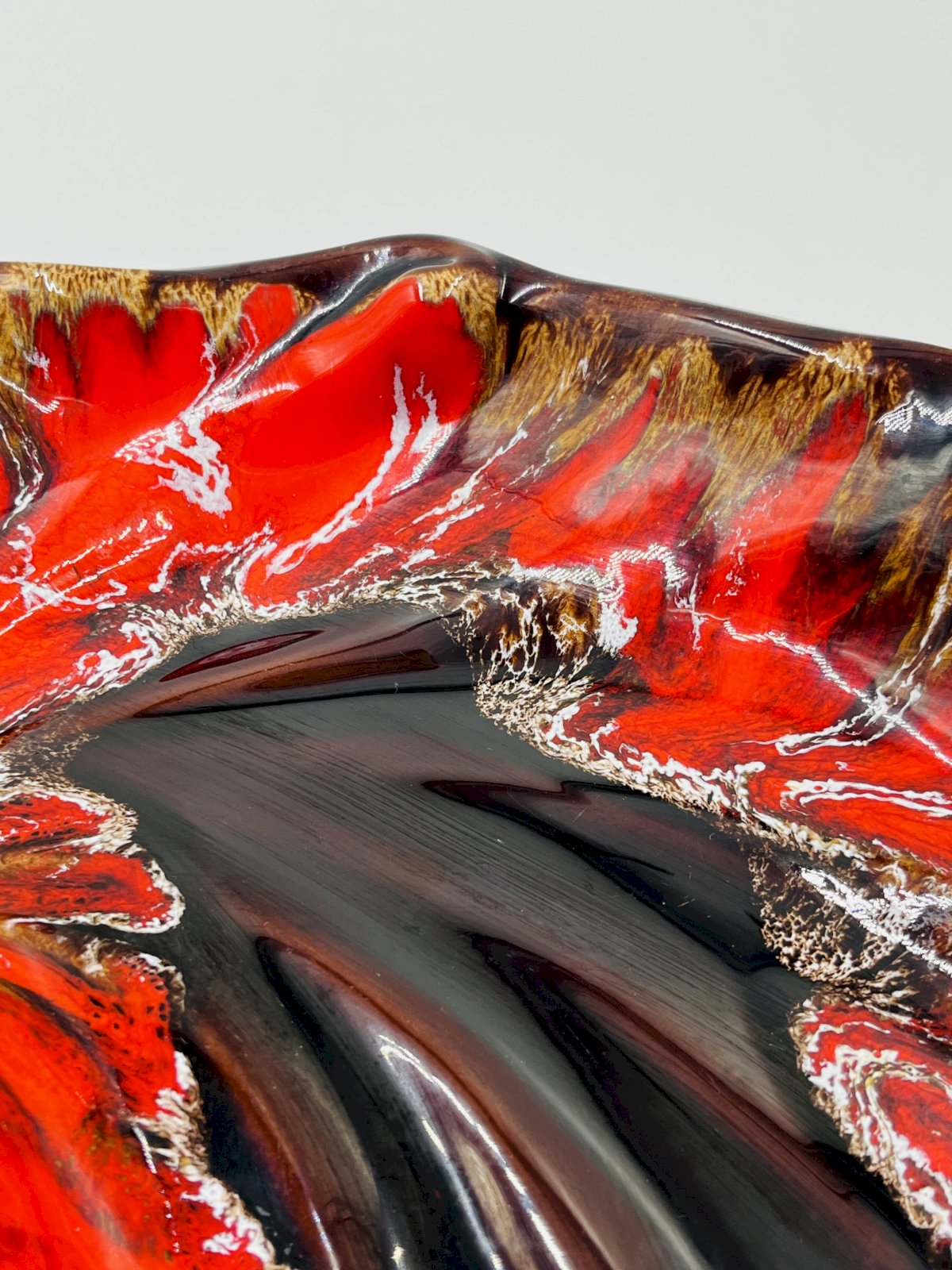 Ce plat en céramique, aux nuances vibrantes de rouge, de brun et de noir, évoque la richesse des créations artisanales du sud de la France.