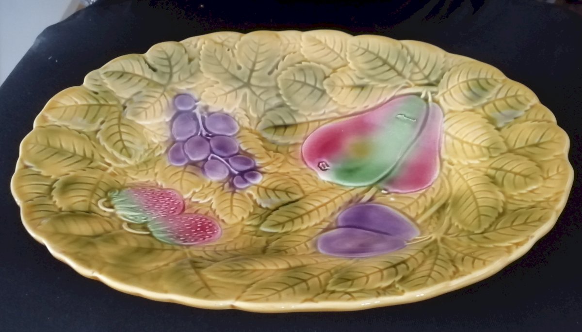 Grand plat ovale ancien, demi creux céramique barbotine Sarreguemines.