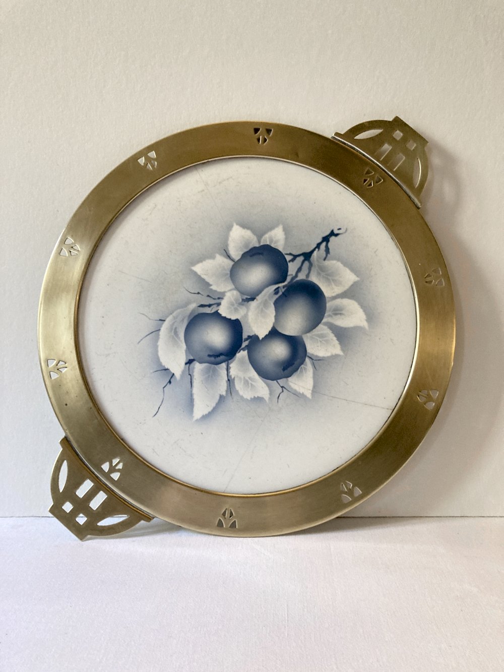 Plateau de service ou plat à gâteau de style Art Nouveau composé d'un plateau en faïence orné d'un motif représentant des prunes, et d'une monture en laiton avec deux poignées aux motifs ajourés.