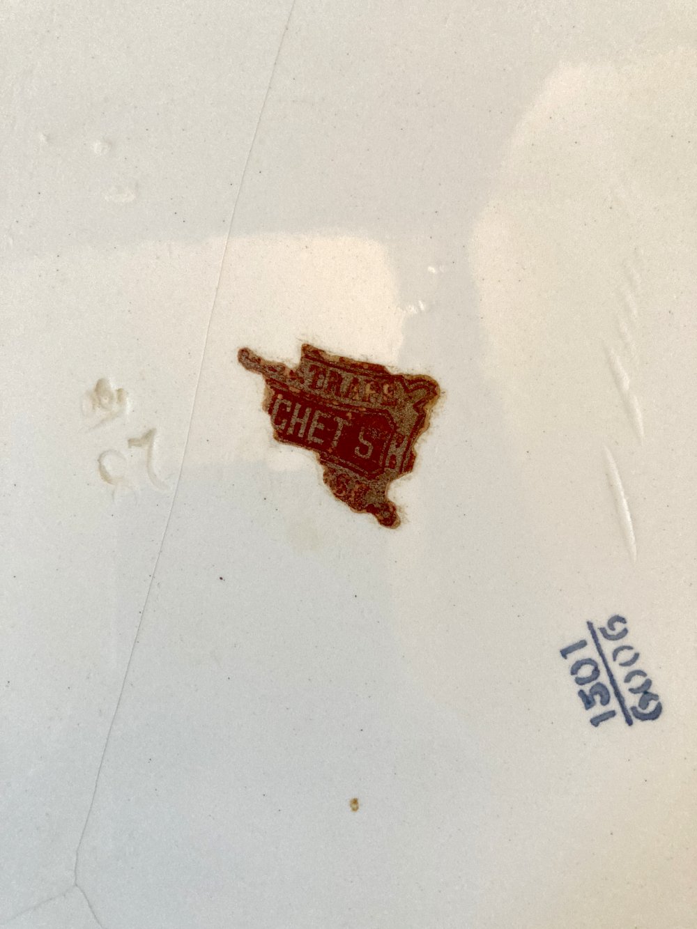 Il est dans son état vintage : le plateau en céramique comporte de multiples petites griffures ainsi que trois départs de fêlures. La monture en laiton et en bon état général avec traces d'oxydation sur le revers.