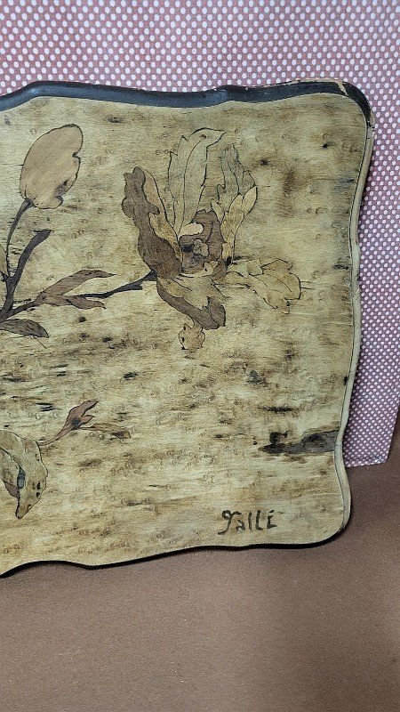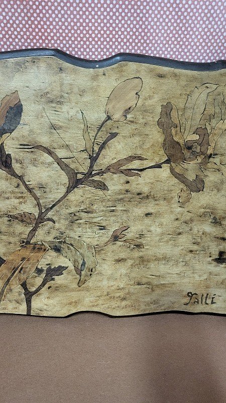 joli plateau de coiffeuse travailleuse en marqueterie signé Gallé il est en bon état mais dans son jus tout est visible sur les photos c'est une belle pièce il mesure 53.5 cm de large sur 38 cm de profondeur et 1.5 cm d'épaisseur Type:PLATEAU DE COIFFEUSE TRAVAILLEUSE Sous-type:Plateau