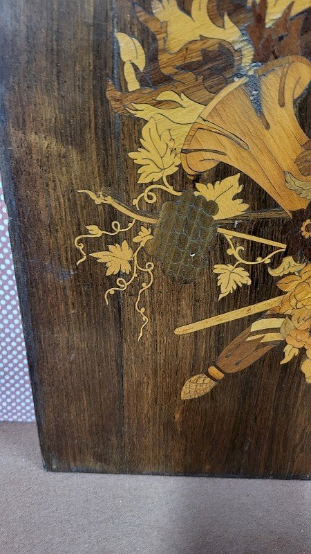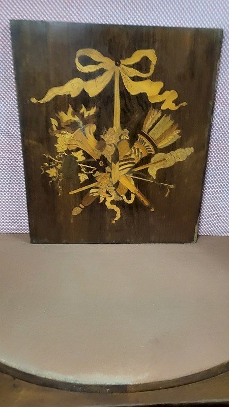 joli plateau de marqueterie style Louis XVI il est en bon état il y a juste la bordure qui est un abimée (voir photos) il y a un trou de vers sur la façade il mesure 36.6 cm de large sur 42 cm de haut et 1.2 cm d'épaisseur Type:PLATEAU DE MARQUETERIE