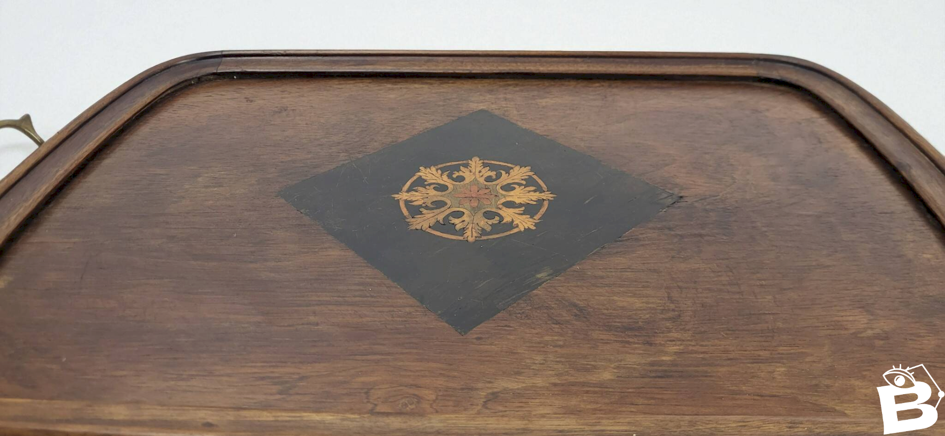 Plateau de service en bois marqueté.Dimensions hors poignée 31*44 cm.Hauteur 2 cm environ.Il manque 2 petits morceaux de bois au revers (angle) et très peu visibles.En bon état / traces d'usage et d'ancienneté minimes.Emballage soigné et livraison rapide.
