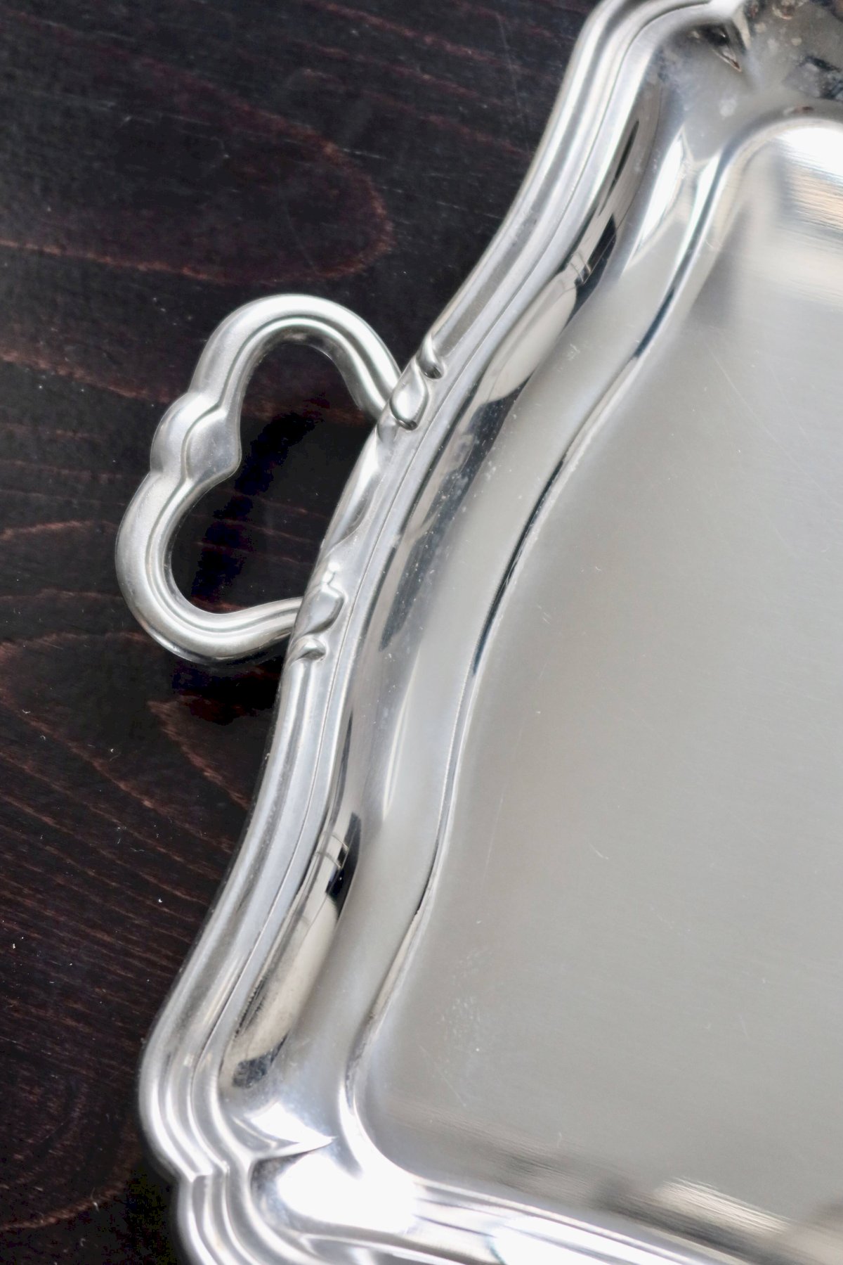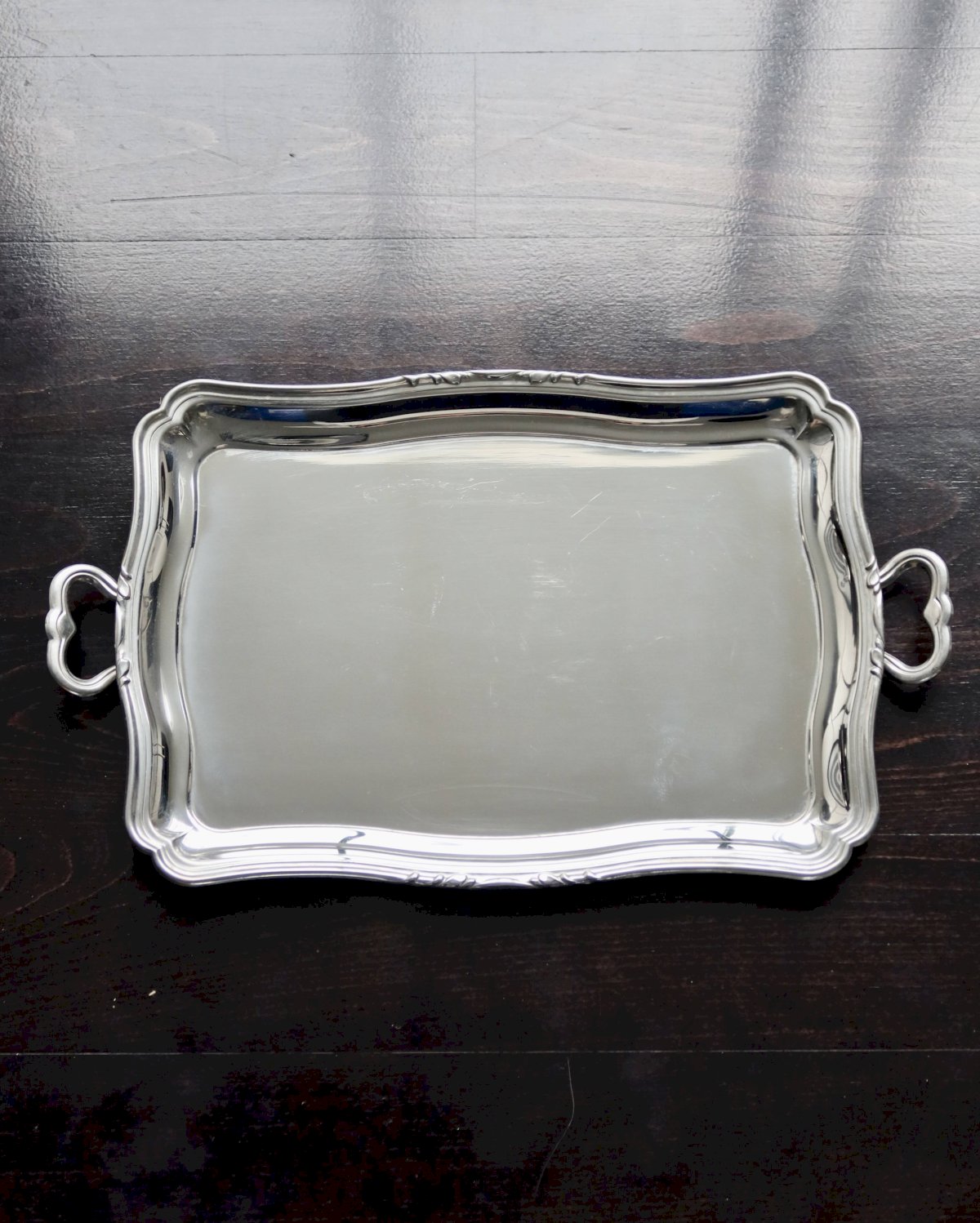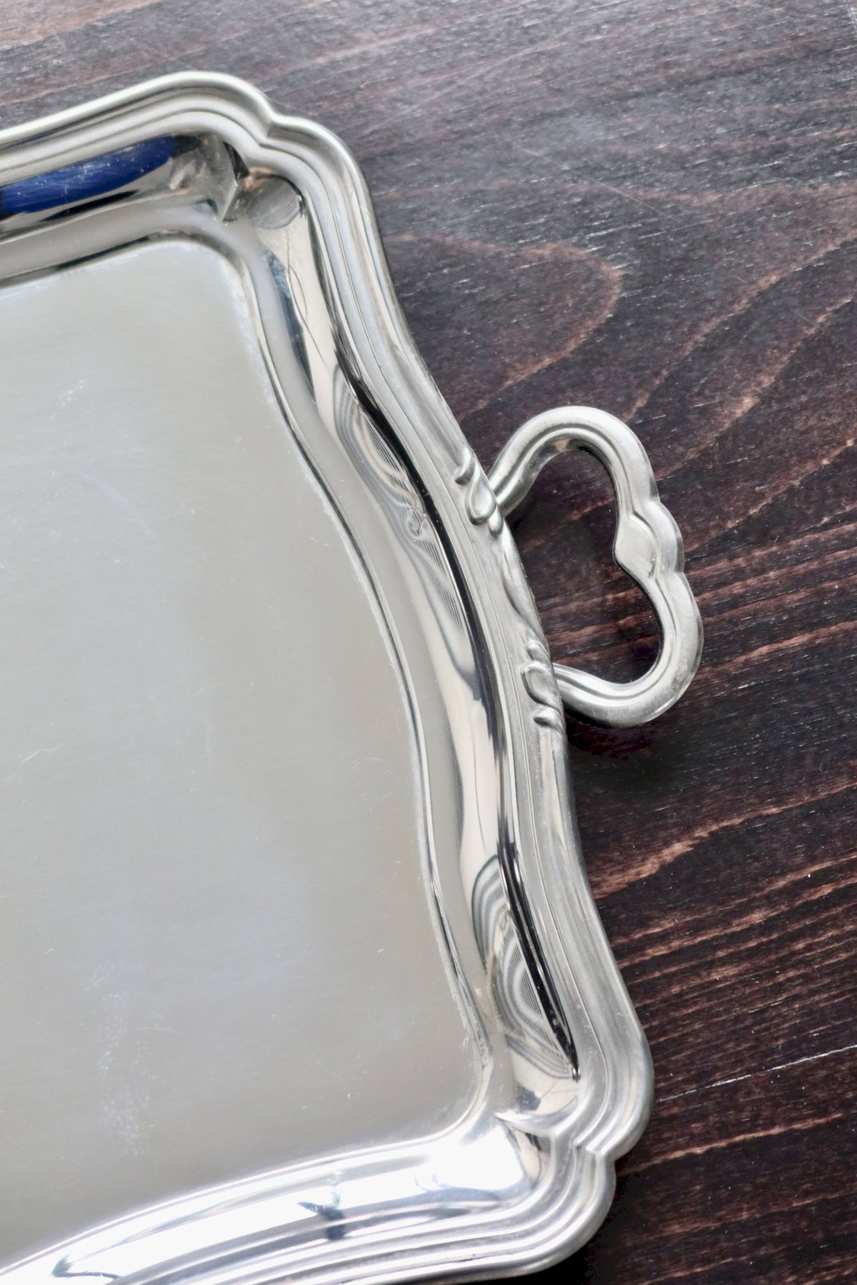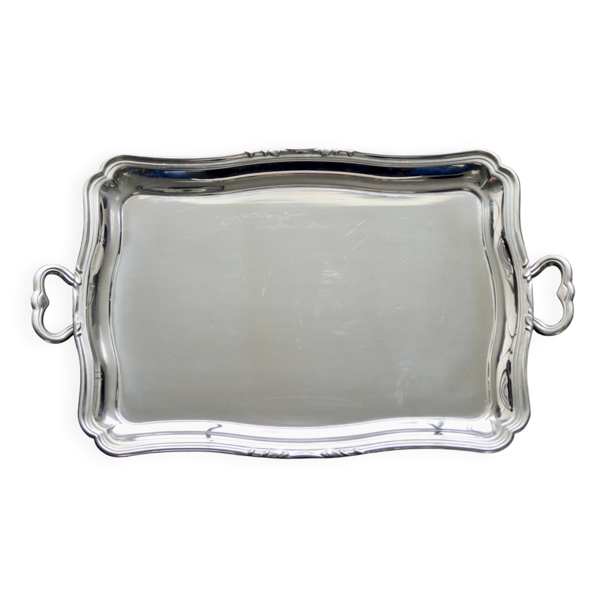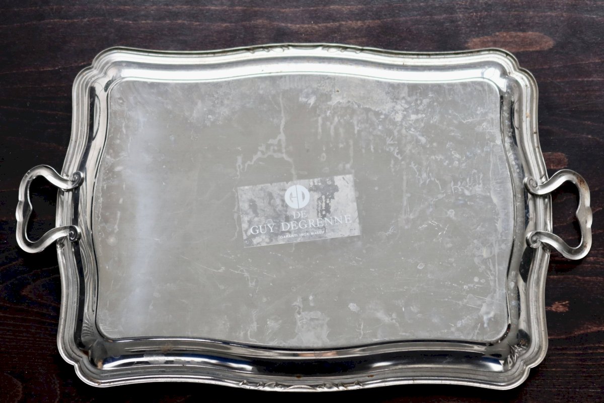 Plateau de service vintage en métal argenté Guy Degrenne, à contours chantournés et poignées latérales élégantes.