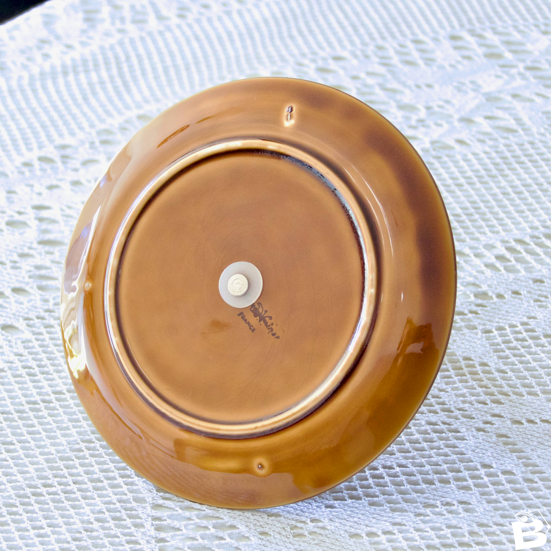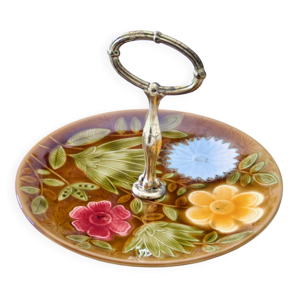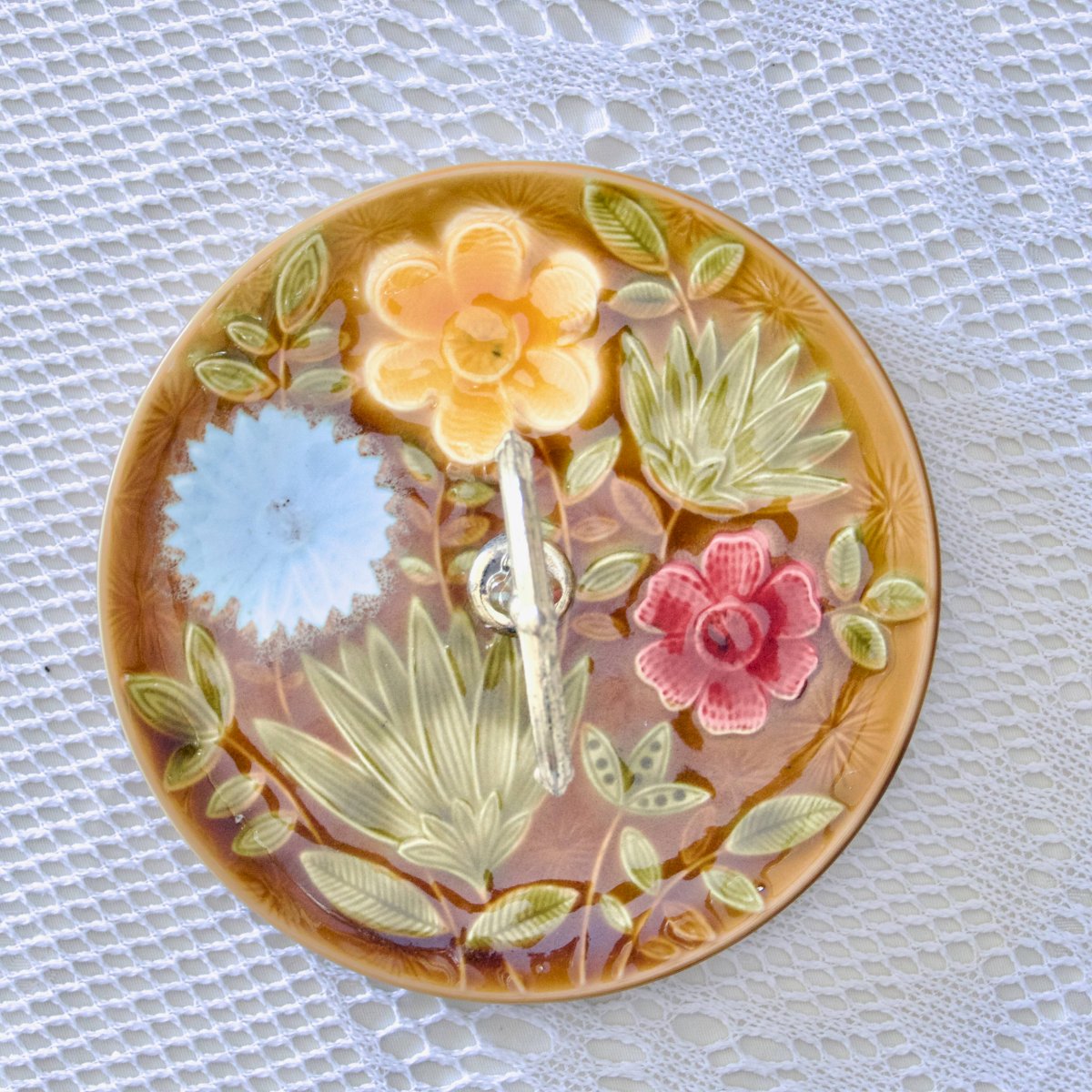 Joli plateau à fromage ancien en barbotine de Sarreguemines.Décor de fleurs tricolores, jaune, rose et bleu.