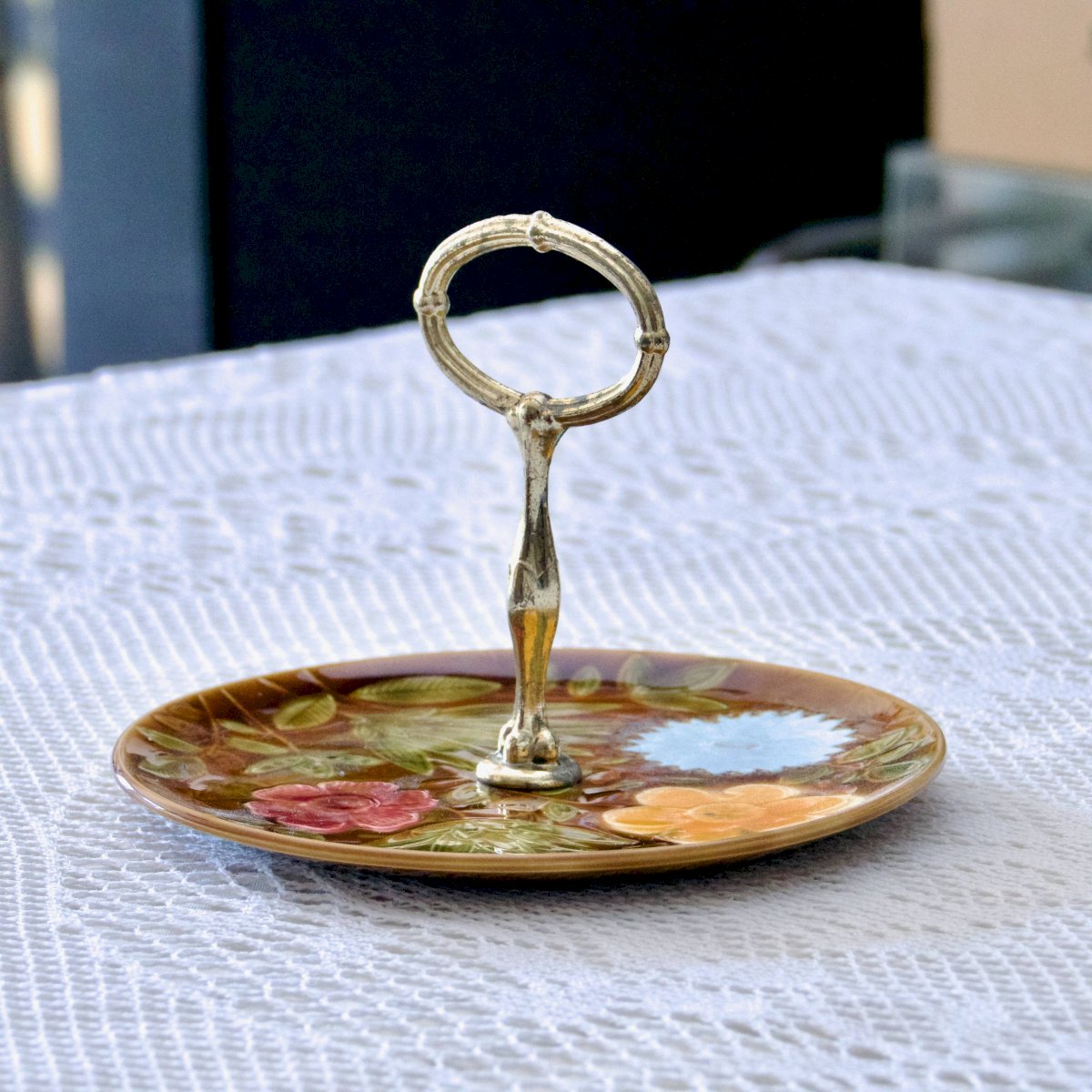 Le tout entouré de feuillage.Poignée en métal argenté.Idéal pour présenter l’apéritif.En très bon état.? 19, 5 X 14 cm.✨ Envoi très soigné.✨ Nous avons d'autres annonces en ligne, n'hésitez pas à jeter un coup d'oeil ! 380 g.02/25.