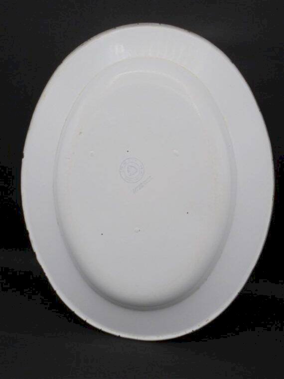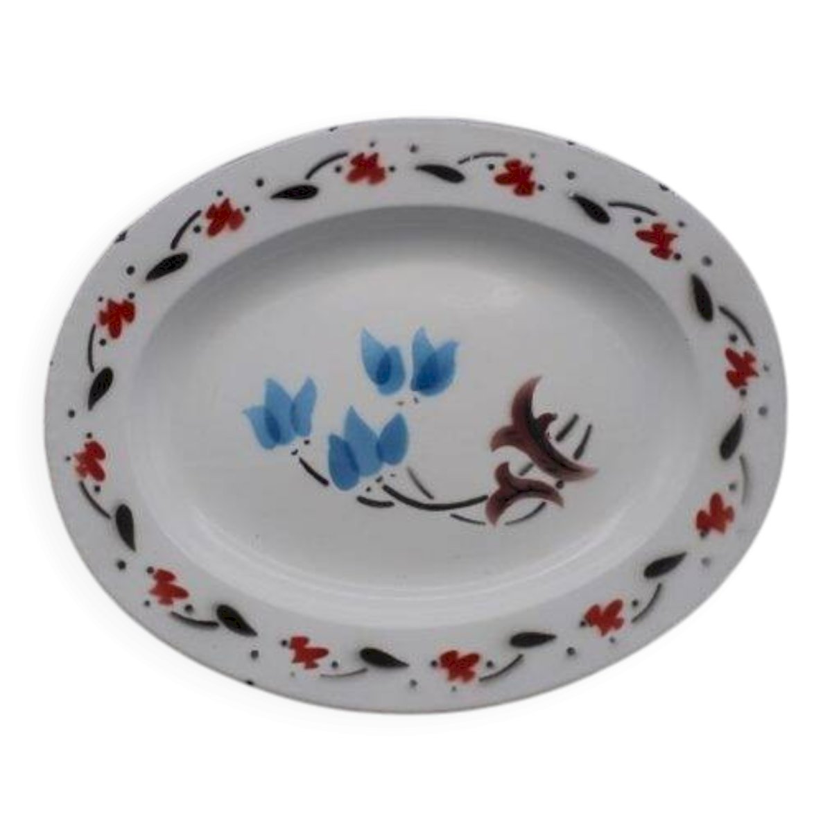 Plateau chinois émaillé de forme ovale, décor floral.Il porte quelques minimes éclats sur les bords.Dimensions: 39.5 X 31.5 X 3 cm.Poids: 540 g.