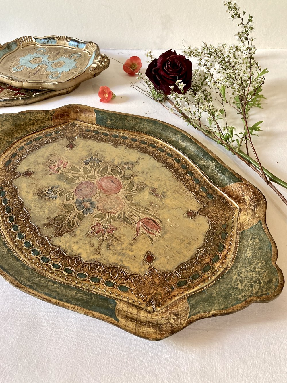 Plateau florentin en bois peint, 1950-1960 Doré/Rouge/Vert Floral,Végétal