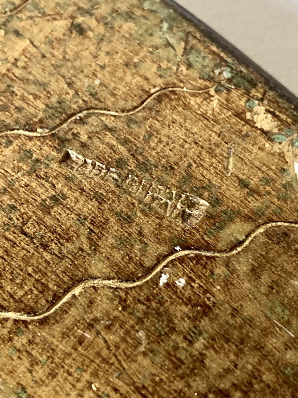 Le rebord est chantourné, peint de vert à effets marbrés.