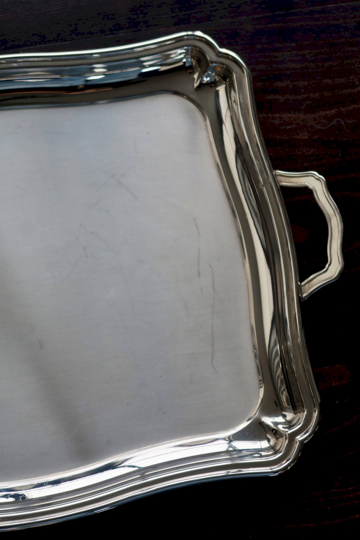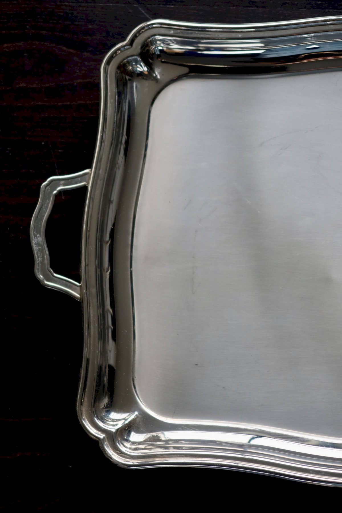 Grand plateau de service en métal argenté, au contour chantourné et aux deux poignées latérales moulurées.